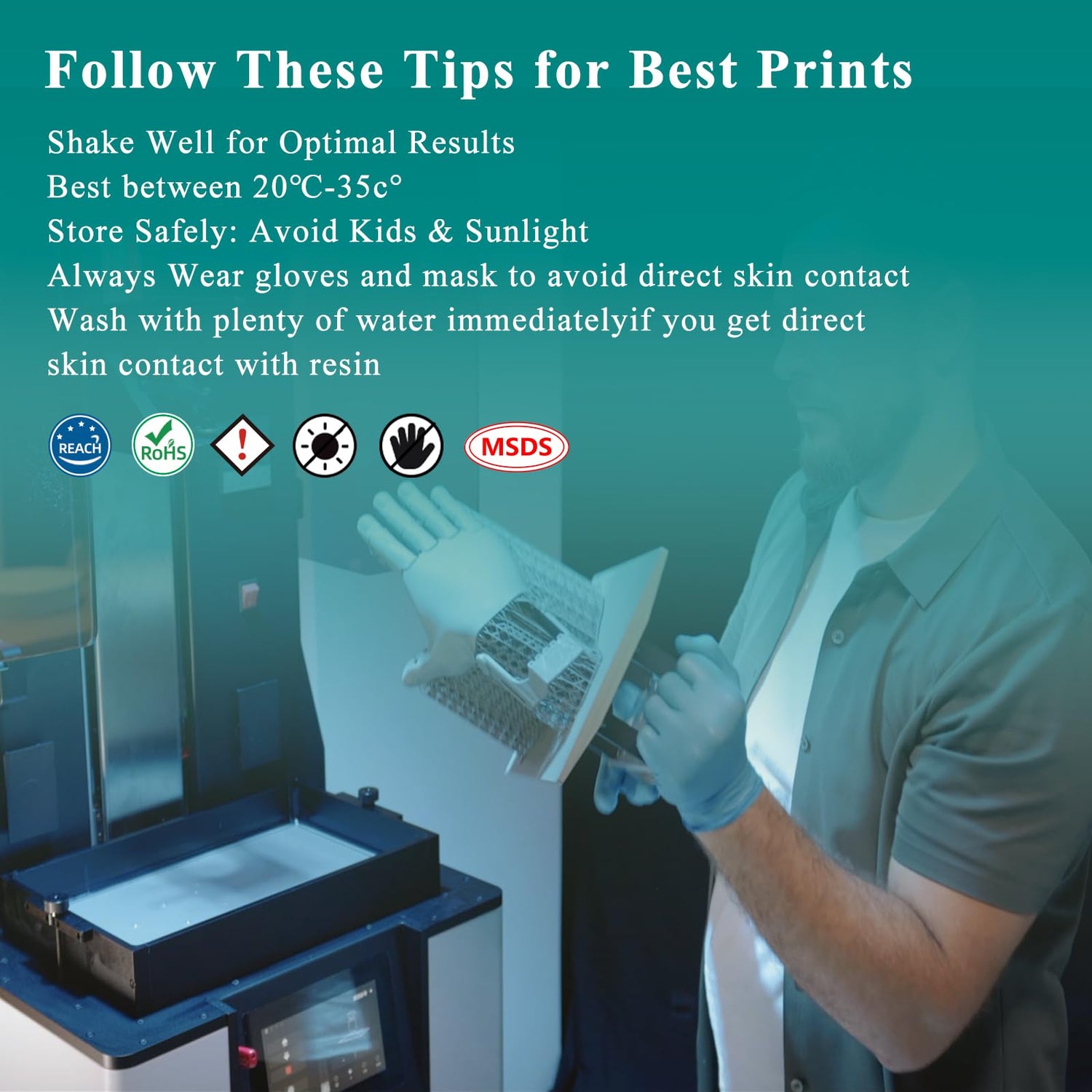 - High Quality&High Precision: As a professional resin manufacturer, this washable 3D printing resin has been tested and upgraded many times, and has been greatly optimized in terms of fluidity, low odor and high precision. We are committed to improving the quality and efficiency of the entire printing process to ensure excellent precision and stable performance, and to ensure that every customer can experience excellent print quality, higher precision and the charm of 3D printing