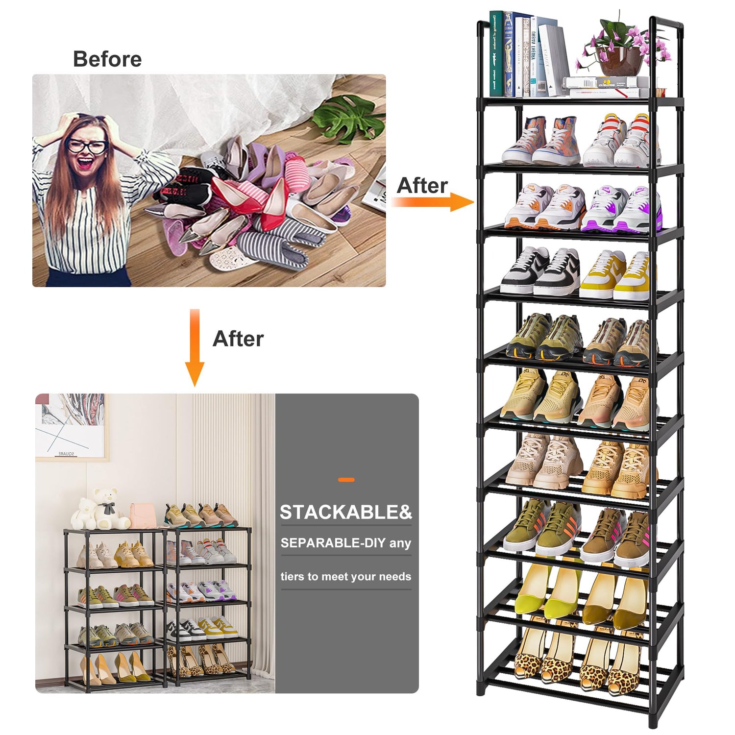 - Makes vertical shoe rack organizer better use of a small space - The compact small shoe rack tall narrow takes up very little floor space and free standing shoe racks for closets, entryway, apartment, hallway, wardrobe, or some other temporary space,also as garage shoe rack small space.If expandable shoe rack 5 tier then can stack black shoe rack to a 10 tier shoe tower, as entryway shoe rack or shoe shelf for closet, or front door shoe rack.