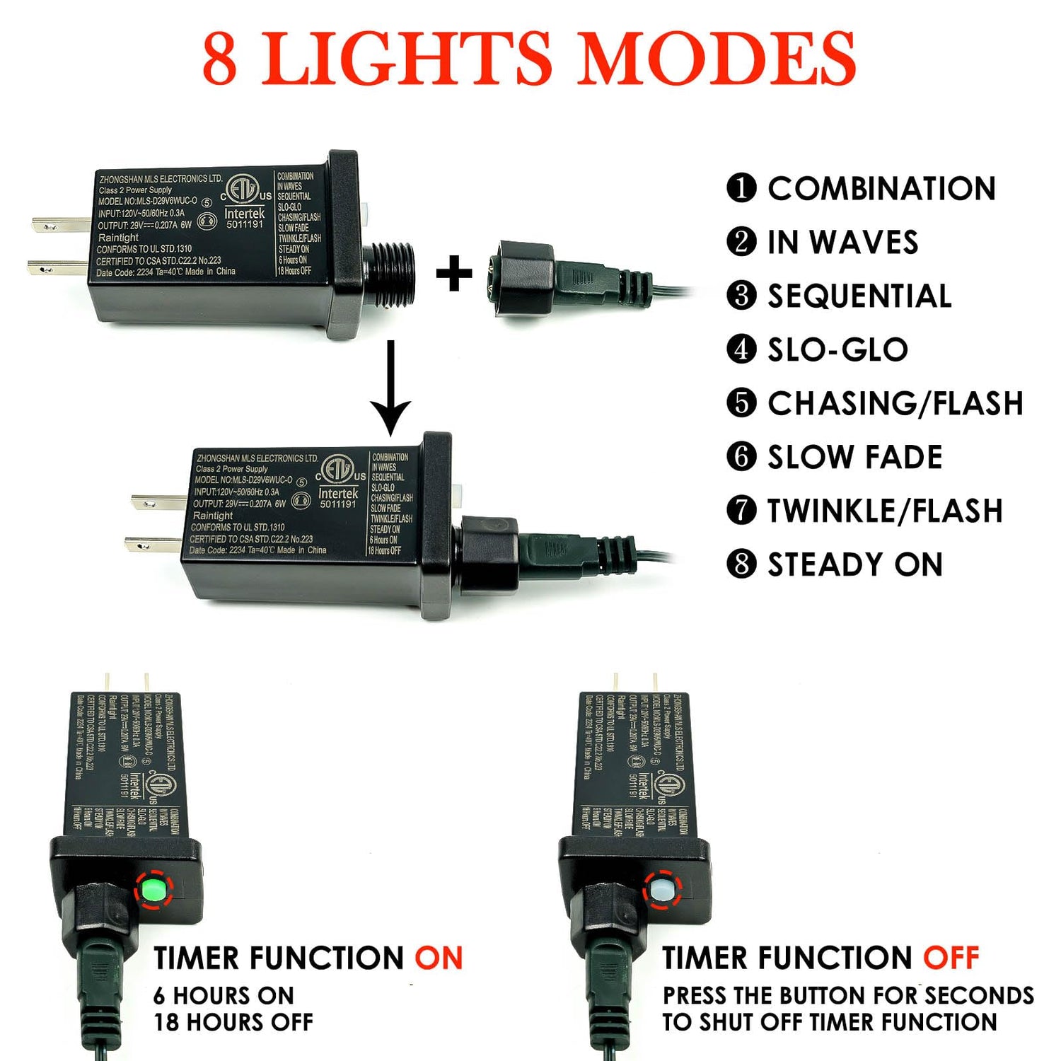 - 8 Modes & Multiple Choice: Christmas lights outdoor adjustable light buttons on transformer with 8 modes: Combination, In Waves, Sequential, Slo-glo, Chasing/Flash, Slow Fade, Twinkle/Flash, and Stay On. String Lights different modes can be adjusted according to personal preferences and ambiance