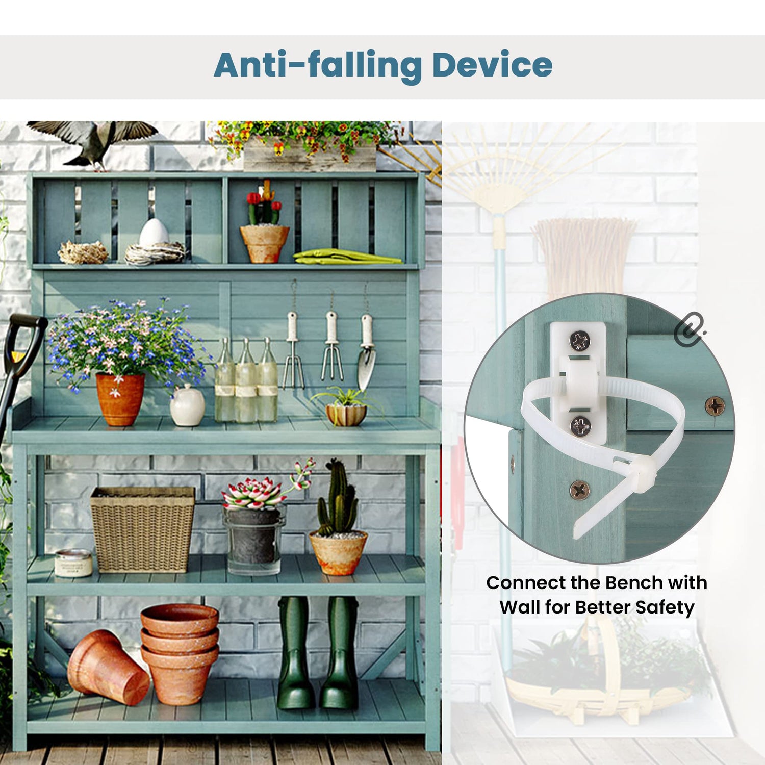 - Durable and Sturdy:This garden bench table is made of solid wood, very sturdy and strong,patio bench table is designed with an anti-falling device. Just connect the device with wall for better safety. To strength stability, 4 supportive bars are offered to fixed in the lower shelves. They can be fixed in any corner until the table is stable.