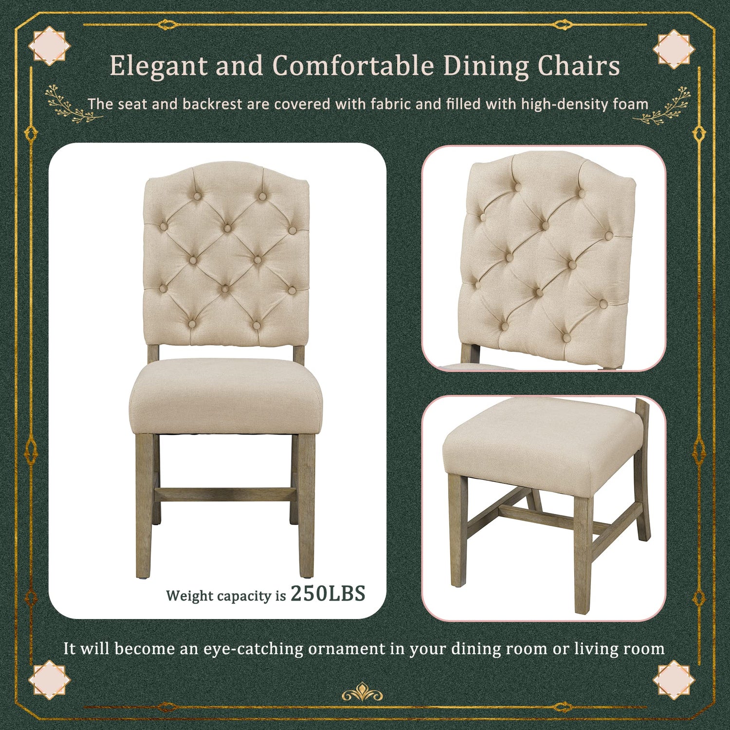 - 【Elegant and Comfortable Dining Chairs】This is a chic dining chair, the seat and backrest are covered with fabric and filled with high-density foam. Its beautiful lines, back flared legs and delicate button tufting details are elegant and thoughtful in design. No matter where it is placed, it will become an eye-catching ornament in your dining room or living room. Rubber wood chair legs are sturdy and durable, ensuring the service life and fixed number of years.