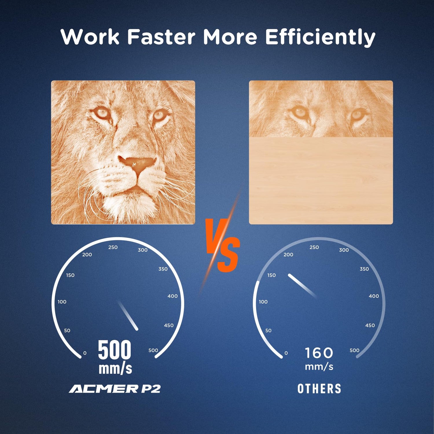 - Ultra High Precision & Speed: ACMER P2 laser engraving machine adopts industrial guide rails instead of wheels, which improves the stability by 20% compared with other machines, and ensures 0.01mm high motion precision and 0.001mm repeatable positioning accuracy. P2 33W laser head adopts 0.08mm compressed spot technology to realize detailed and realistic engraving images. Maximum engraving speed up to 30000mm/min.