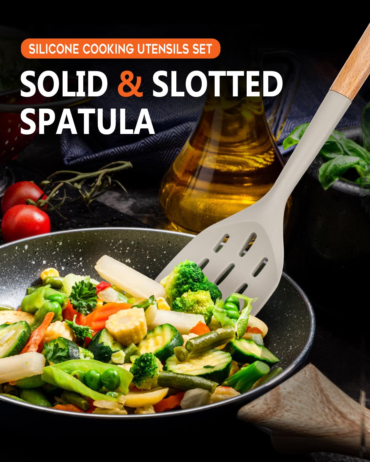 Pack of 2 Silicone Spatula, Non Stick Cooking Utensil Set Wooden Handle Kitchen Turner for Baking Mixing Grilling Serving Food Heat Resistant Non Scratch Hooks Included (Khaki)