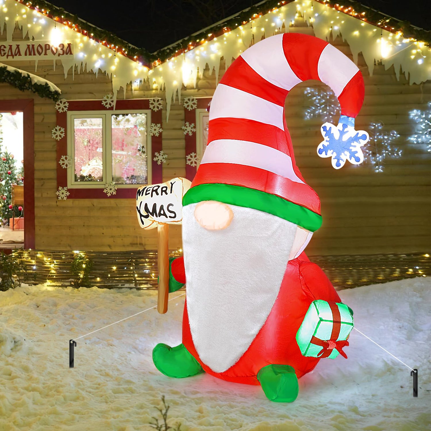 - CHRISTMAS FESTIVE: This delightful inflatable gnome is dressed in traditional clothes. The gnome one hand holds a beautifully wrapped Christmas gift, and the other holds a "Merry Xmas" sign spreading holiday cheer and warm wishes to all who see it, making it a heartwarming decor during the holiday season.
