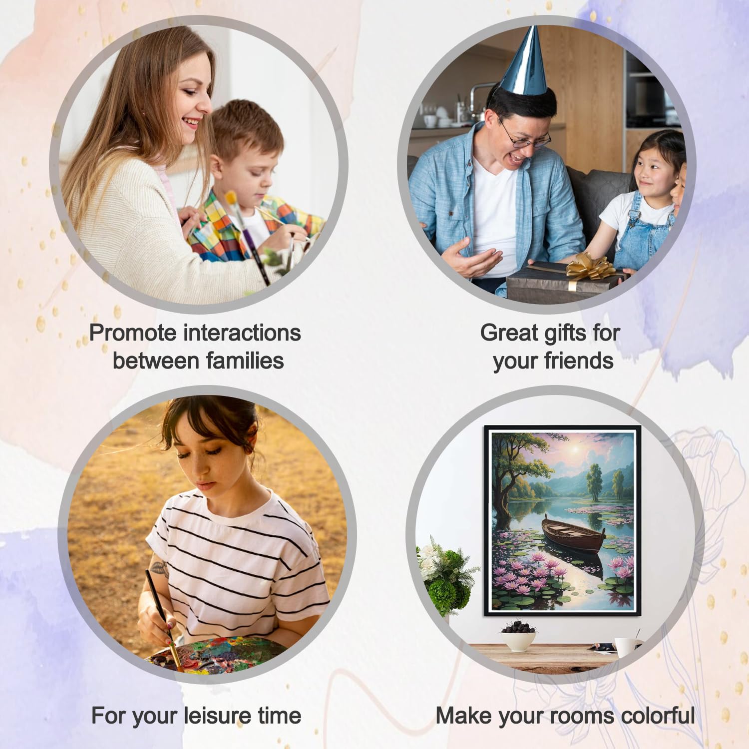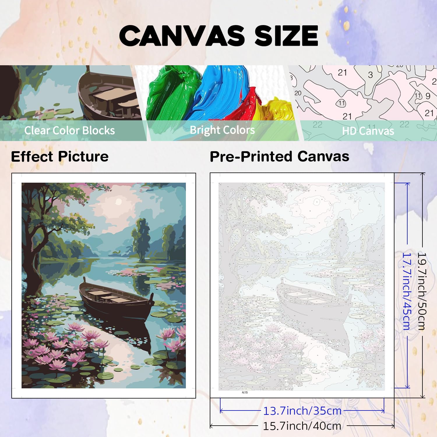 - Lotus Lake Canvas Paint by Numbers for Adults:Our Paint by the Numbers for Adults Kit which is a high-density waterproof for ensuring the uniformity of the canvas texture.Numbers on the canvas are clear and easy to read.The acrylic paints are full of shinning colours and fade-free when dry.The digital oil painting will last for years after completed.