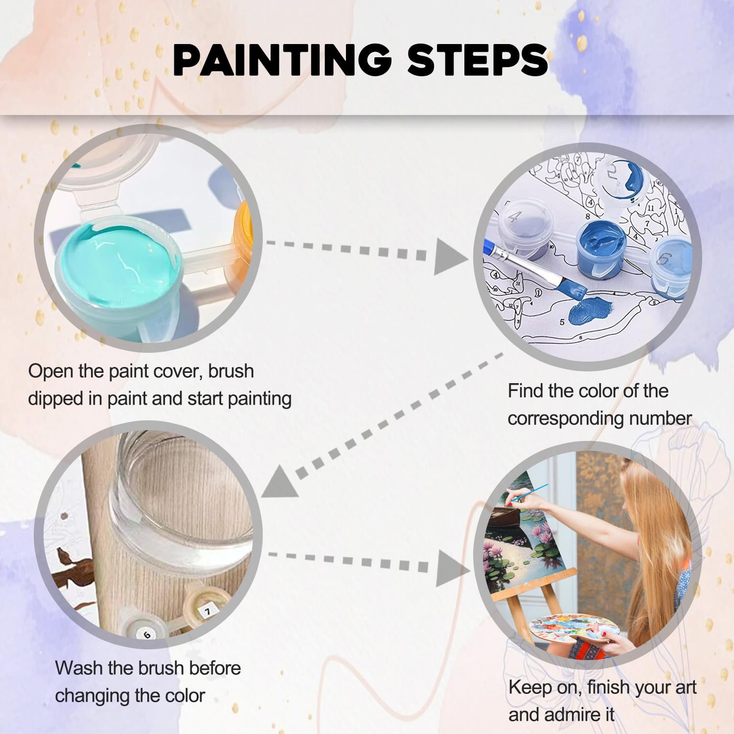 - Benefits of Paint by Number Adults:DIY paint by numbers for adults can experience a sense of achievement.By matching the pigments with the numbers on the canvas and filling the corresponding colors into the numbered areas,you can easily create a amazing work and gain the inner peace to reduce stress during the process.We believe you will definitely love your this paint when this paint by number canvas for adults is finished.