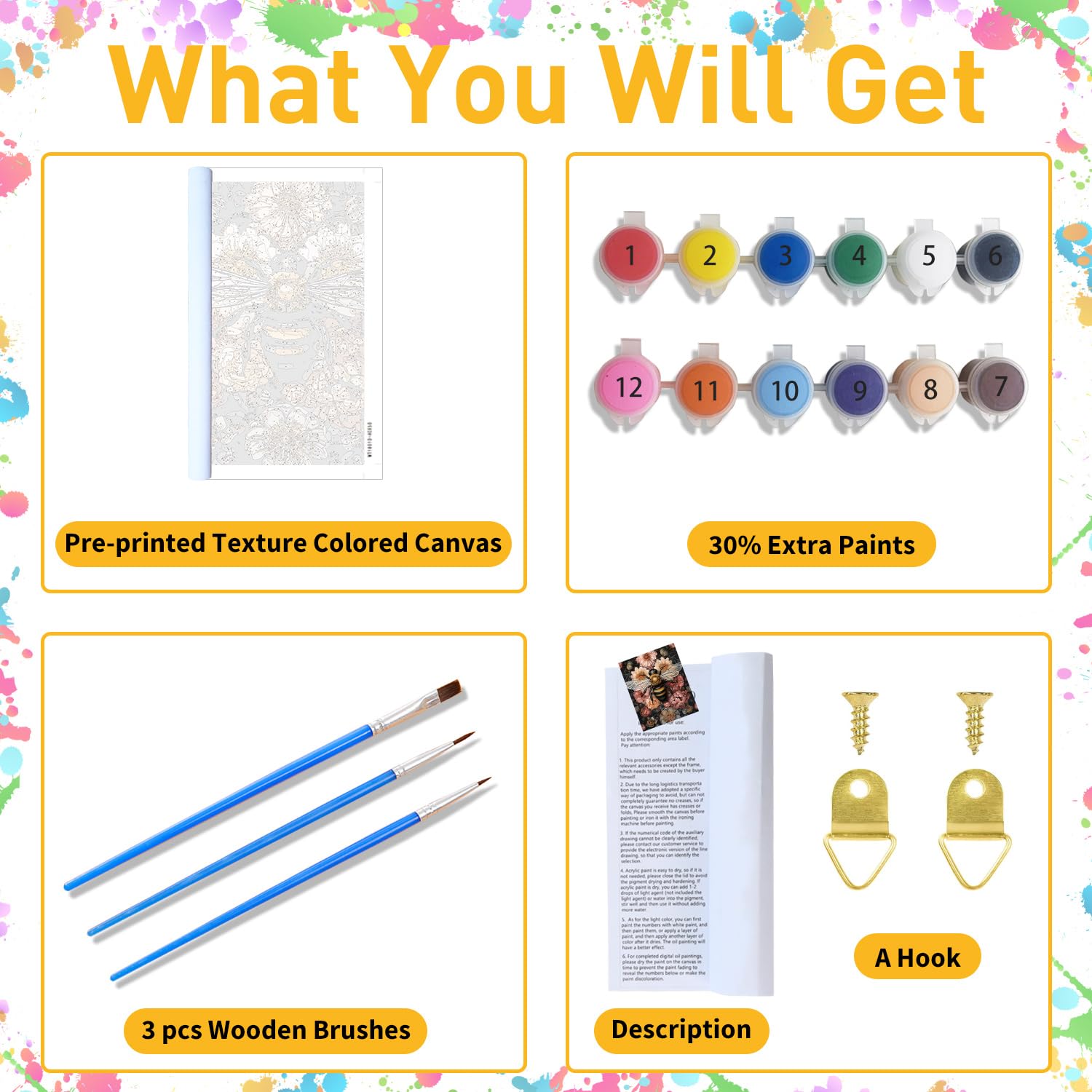 - 【What Will You Get ?】 Our bee paint by numbers kit for adults comes with everything you need to begin: 1x waterproof canvas, 1x matching paint, 3x nylon brushes (different sizes), 1x line drawing, 1x instruction manual, 1x finished effect card, 2x metal hooks.(No frame)