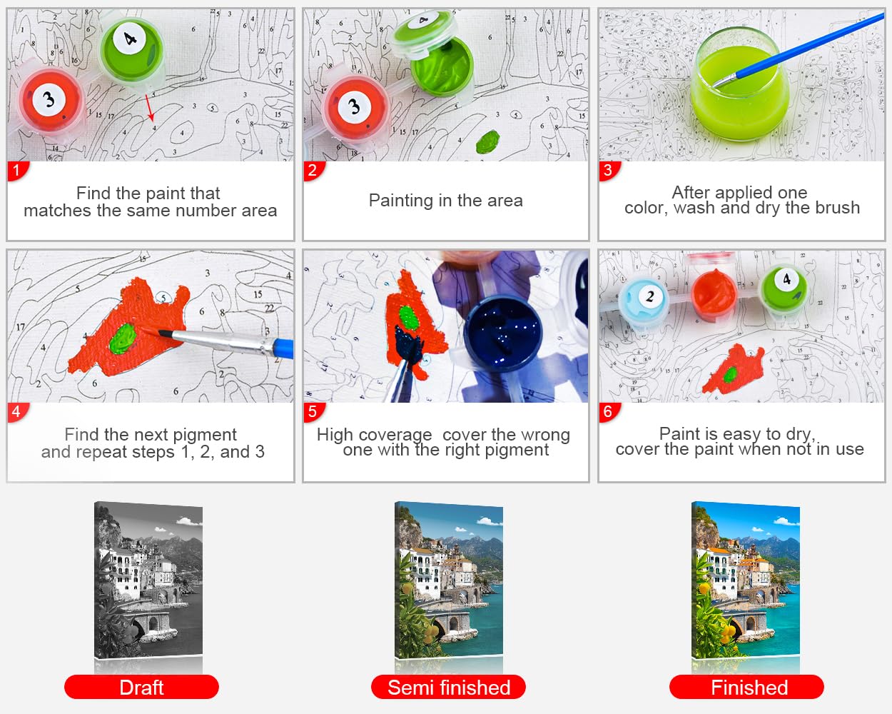 - 🎨 PAINT BY NUMBERS KIT:Includes a 16'' x 20'' canvas (without framed), 3 painting brushes, 1 set of acrylic pigment colors and a sample picture.DIY paint by number kits will make you feel the charm and fun of art.