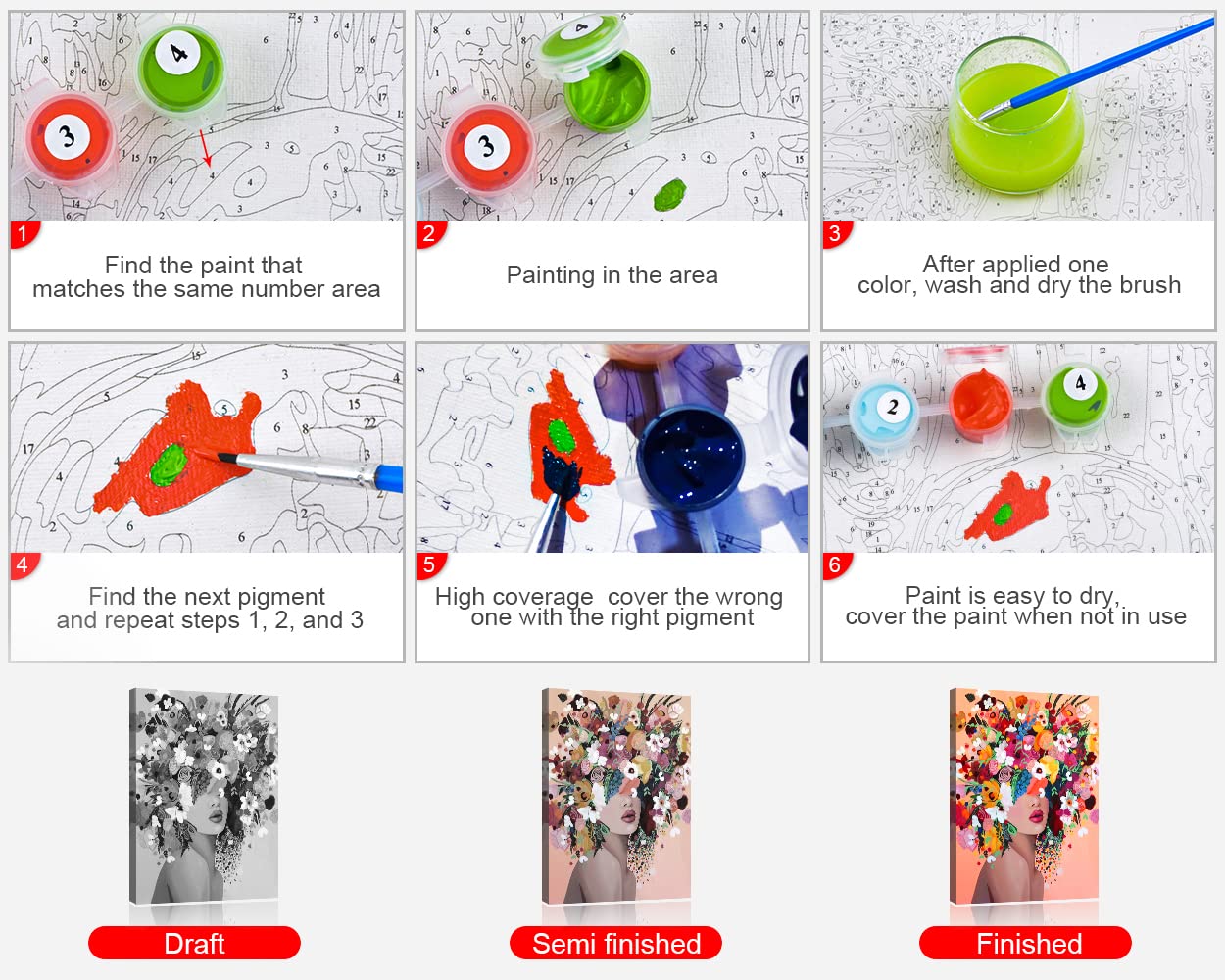 - How to DIY: Paint number are suitable for adults, children and beginners of all ages. Look for the number on the canvas is same the acrylic paint set' number. Then painting in Corresponding area by brushes. No color blending need.