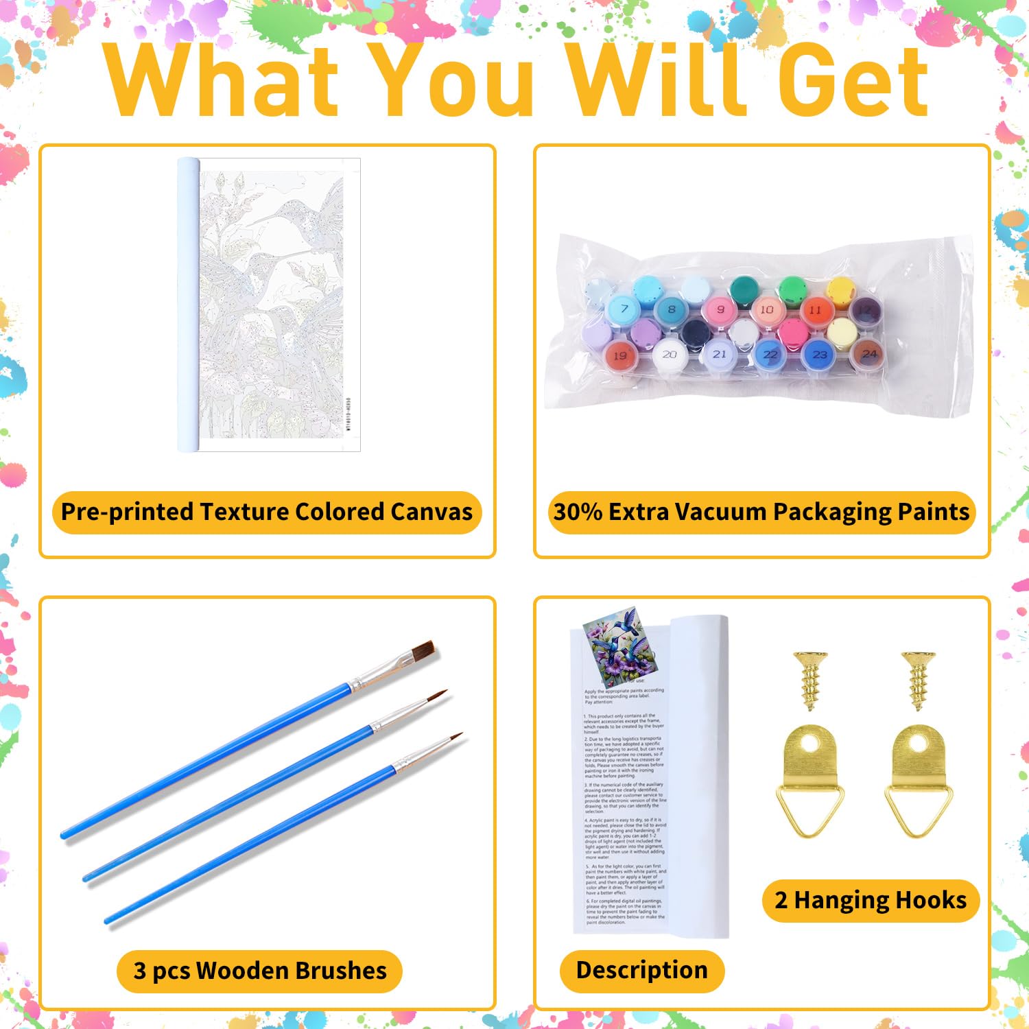 - 【What Will You Get ?】 Our hummingbird paint by numbers kit for adults comes with everything you need to begin: 1x waterproof canvas, 1x matching paint, 3x nylon brushes (different sizes), 1x line drawing, 1x instruction manual, 1x finished effect card, 3x metal hooks.(No frame)