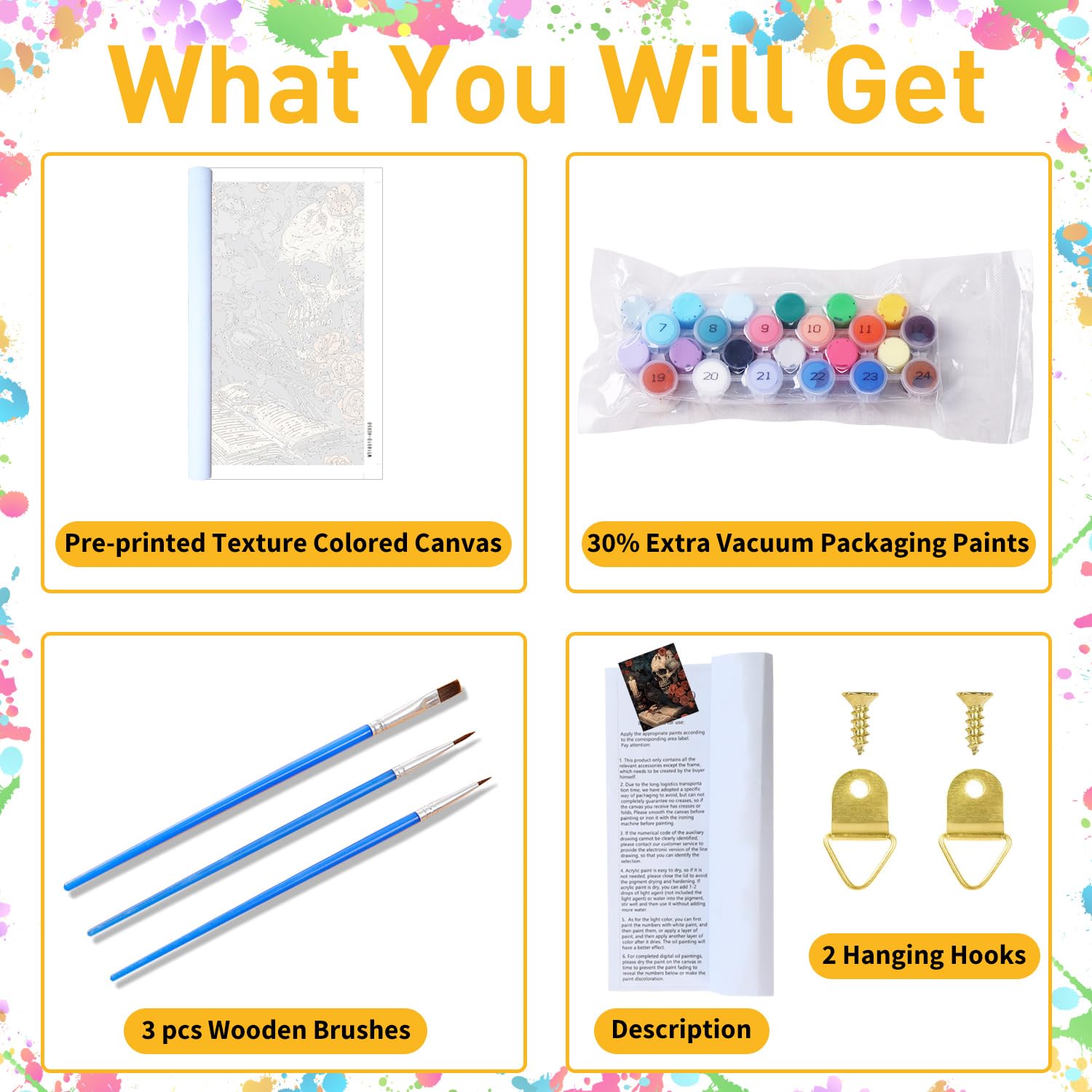 - 【What Will You Get ?】 Our skull paint by numbers kit for adults comes with everything you need to begin: 1x waterproof canvas, 1x matching paint, 3x nylon brushes (different sizes), 1x line drawing, 1x instruction manual, 1x finished effect card, 3x metal hooks.(No frame)