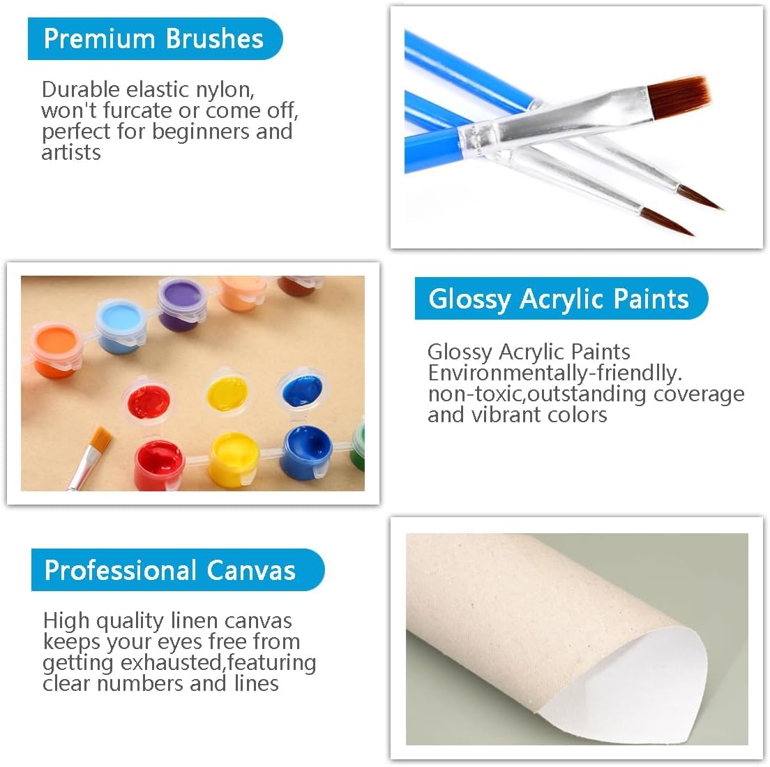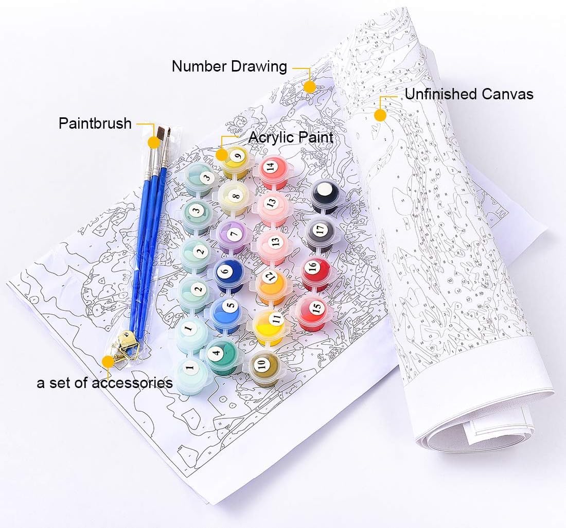 - High Quality Material: The paint-by-number canvas is moisture-proof and waterproof the acrylic paints are safe, non-toxic, and tasteless. HD printing technology makes the numbers on the canvas clear and easy to read.