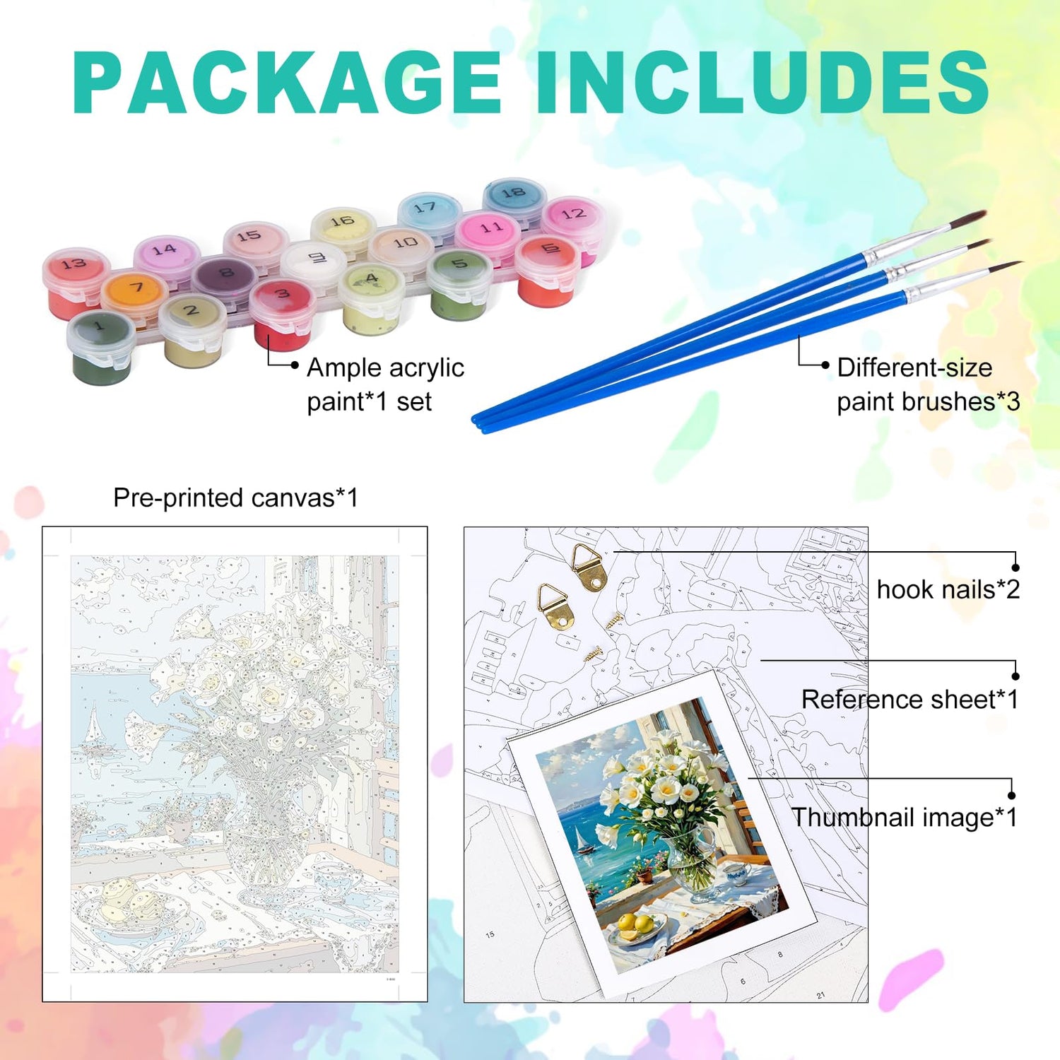- 【What You Will Get】Acrylic DIY paint by numbers kit for adults has a complete tool kit, including 3* nylon brushes, 2* hook nails, 1* matched Acrylic paint sets and 1* pre-printed textured HD colored canvas (without Frame), 1* A4 paper copy of numbered canvas for reference, 1* color postcard guide. Open the package and you can start painting immediately.