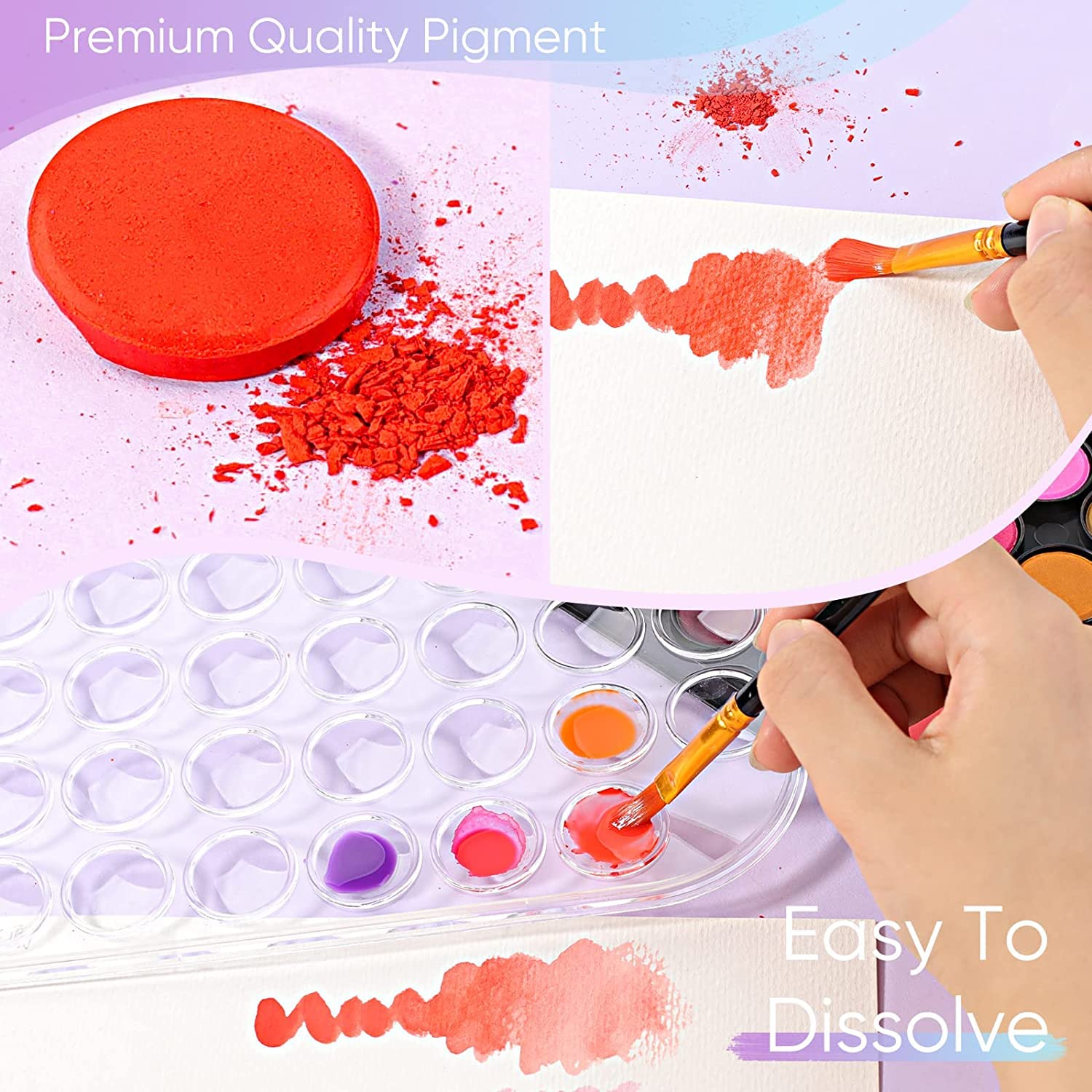 - High-Quality Water Paint Supplies : Use elevated concentration of finely ground top durability pigments, make our solid watercolor paints are durable and will not crack. They are easy to blend colors, washable and dry fast , fading resistant and have excellent fluid, and there's no chalky or grainy feel to them after they are dry, is an ideal arts & crafts supply choice for outdoor sketching, scrapbooking, school projects, homemade/handmade and other leisure art activities.