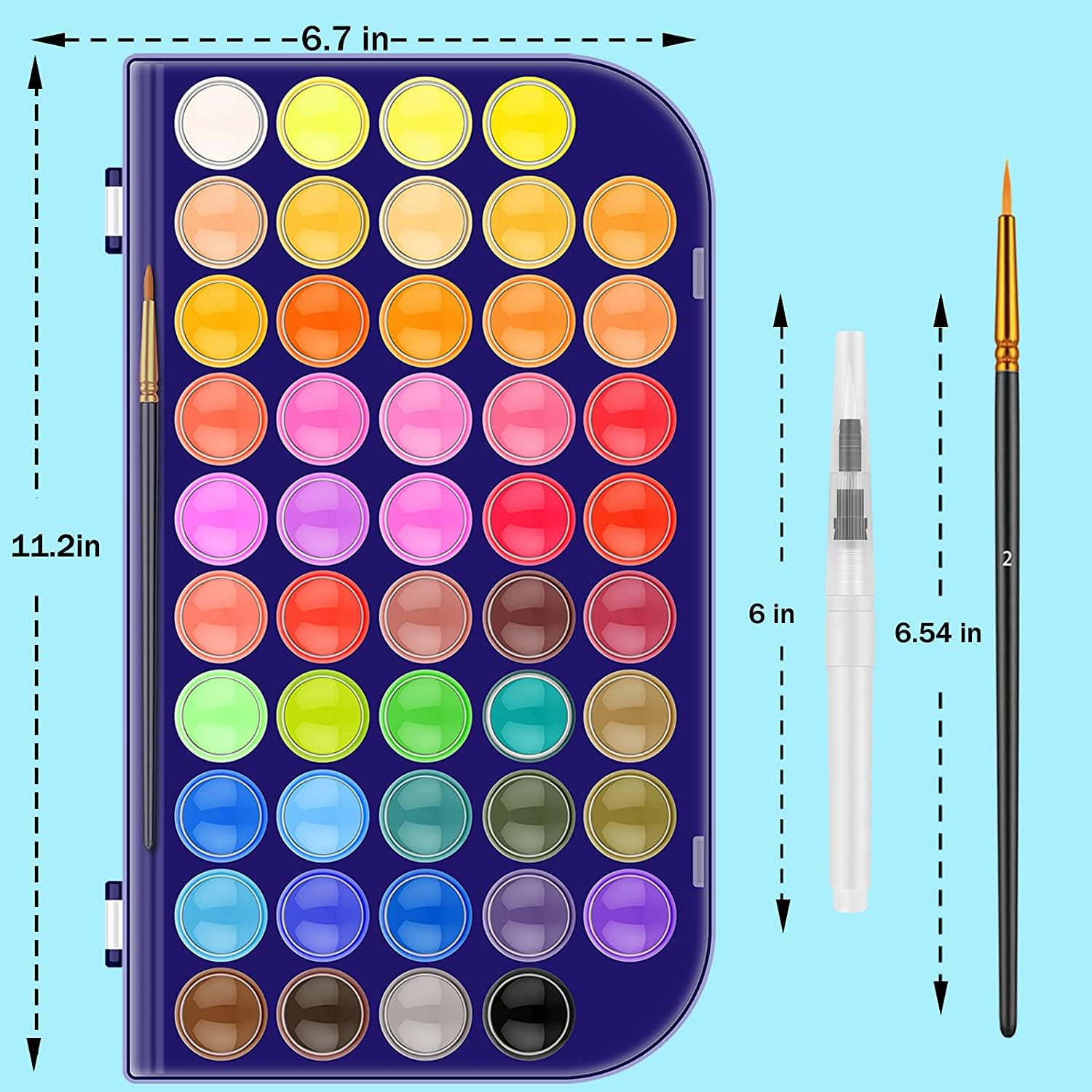 - 48 Vivid Colors Best Watercolor Paints Set :The watercolour paint set including 48 unique vibrant colors,1 paint brush and 1 water pen. fine pigment powder make them soluble in water easily. The color is saturated and beautiful, the effect of halo dyeing is good, the texture is light and thin, with high transparency, and create a natural blooming in your painting paper. You can play your imagination and talent more freely, easy to blend to create an endless range of colors.