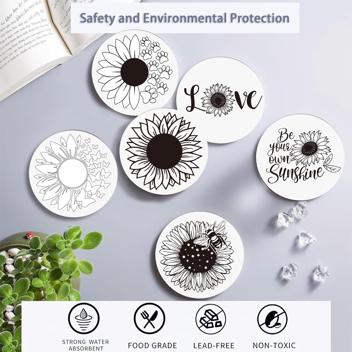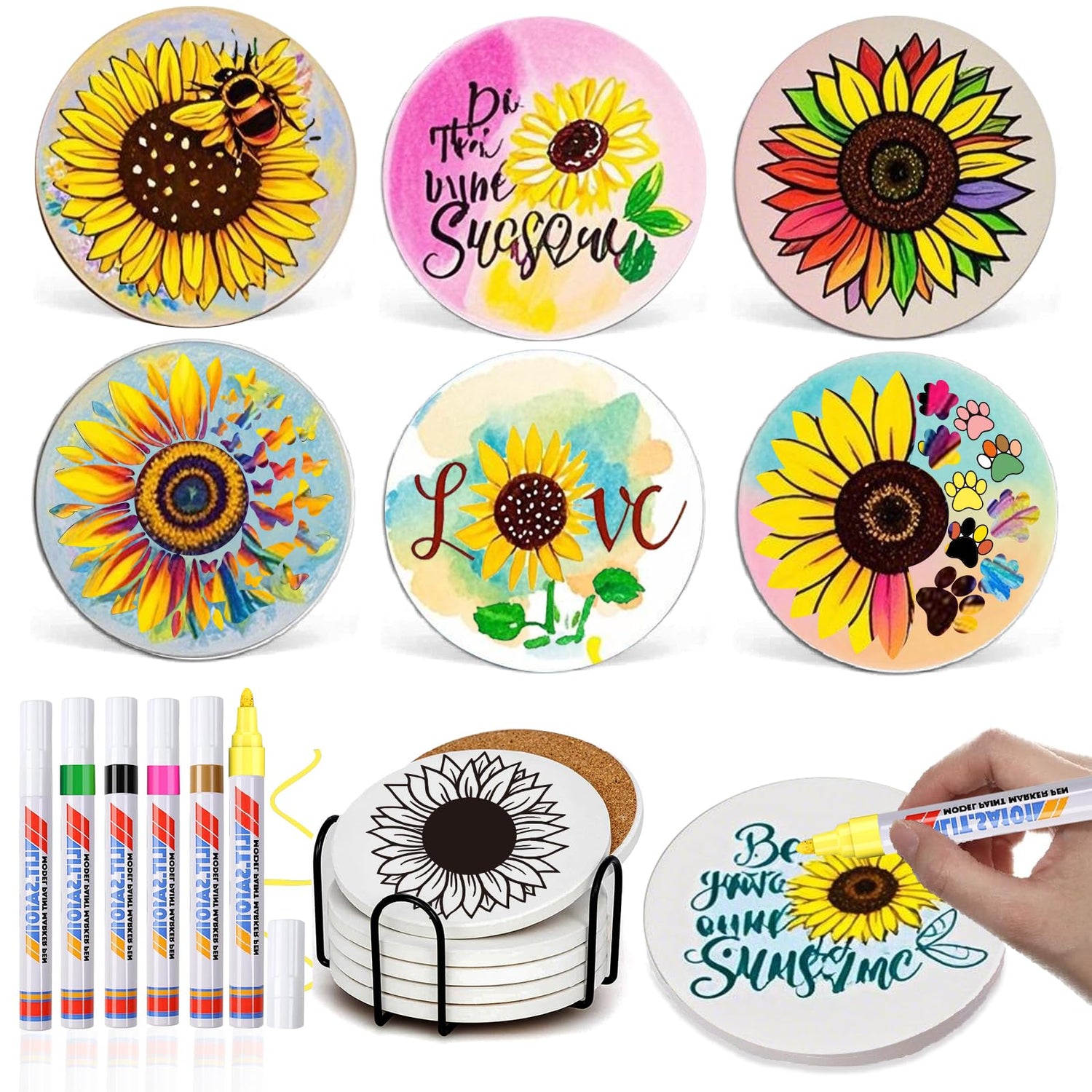 - Sunflower Ceramic Coasters for Crafts: These specialty arts and crafts kits include 6 Blank Coasters with Sunflower Prints for you to color (6 Unique Designs), 6 Specialty Dual Tip Markers (6 Different Colors),Color Your Own Coaster,No fading,exciting activity for all ages,Unleash & spark your creativty,enjoy diy fun. Our coasters with holder DIY supplies,Just find the colored markers you need according to the patten on the coaster to start making,helpful for improving your hands on ability.