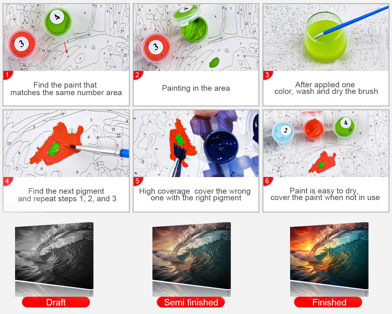 - [Premium Material Quality] Our paint-by-number kits feature a high-density, waterproof canvas that resists wrinkles and ensures smooth color application. Additionally, our non-fade acrylic paints are richly pigmented, maintaining the brightness and richness of colors for an extended period.