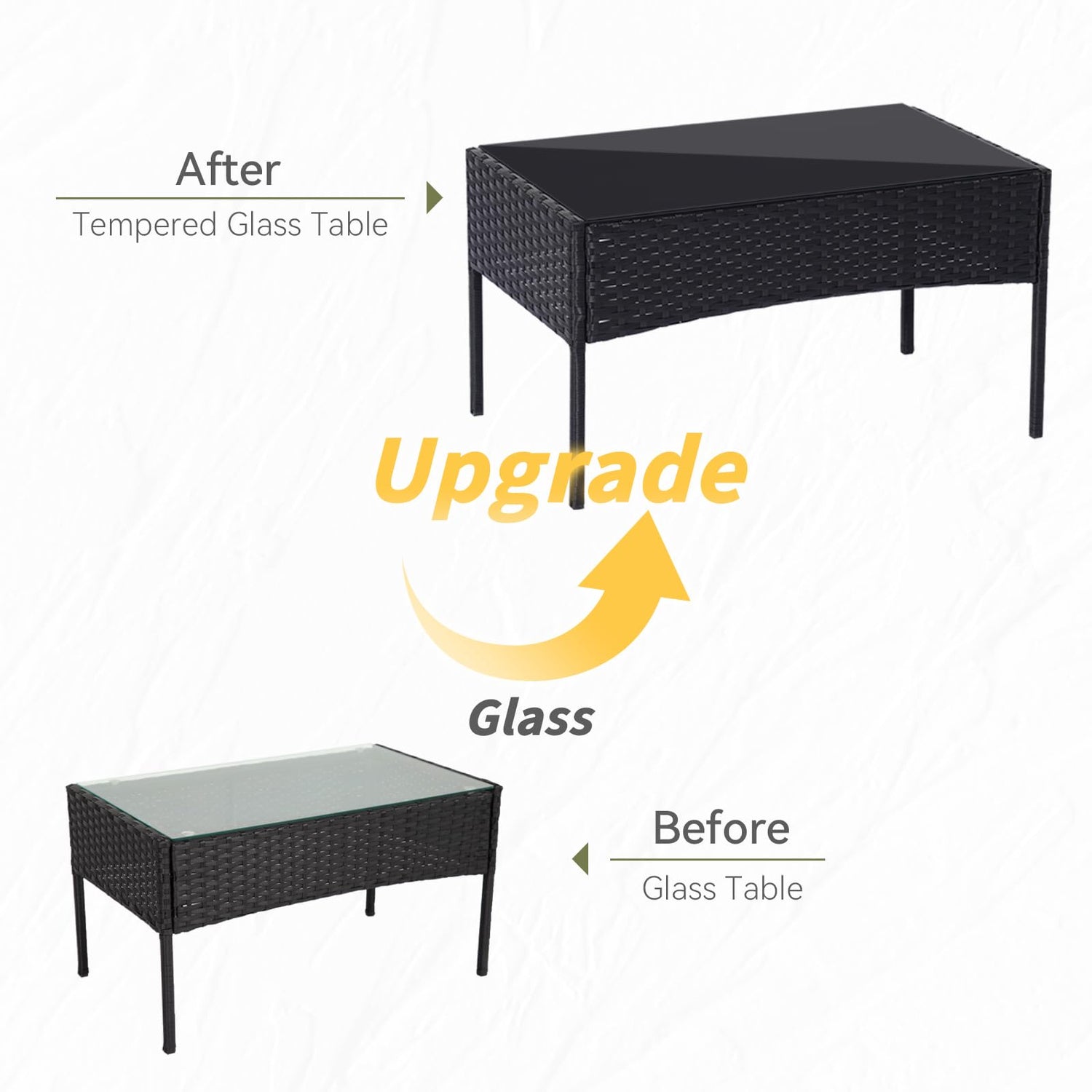- 【Simple & Stylish】- Our outdoor conversation set is modern and stylish, suitable for any size space. Simple and smooth line designed appearance, matched with beige cushions, brings a classic and modern sense to this set. The patio set is made of eco-friendly rattan , sturdy and light. Useful tempered glass coffee table is suitable for placing drinks, foods and fruits.