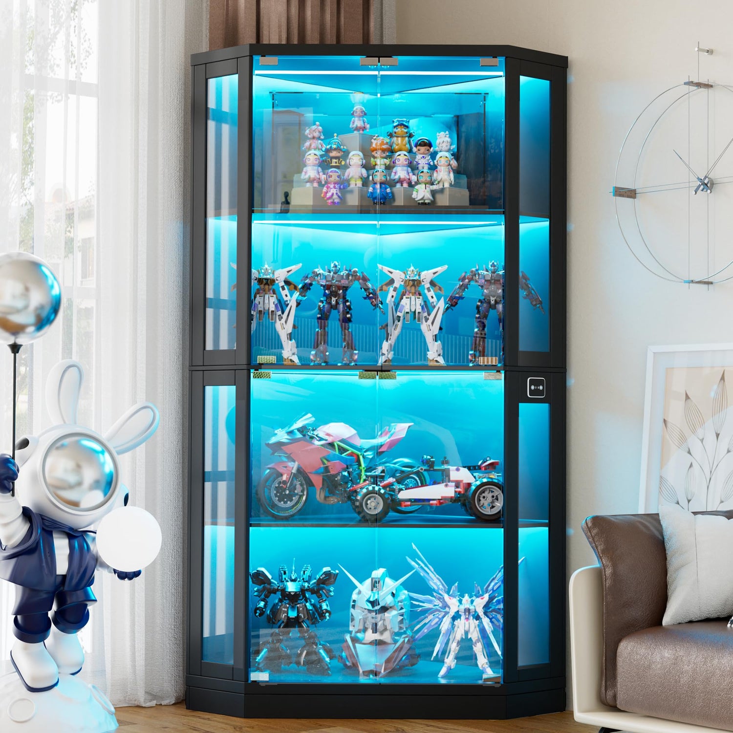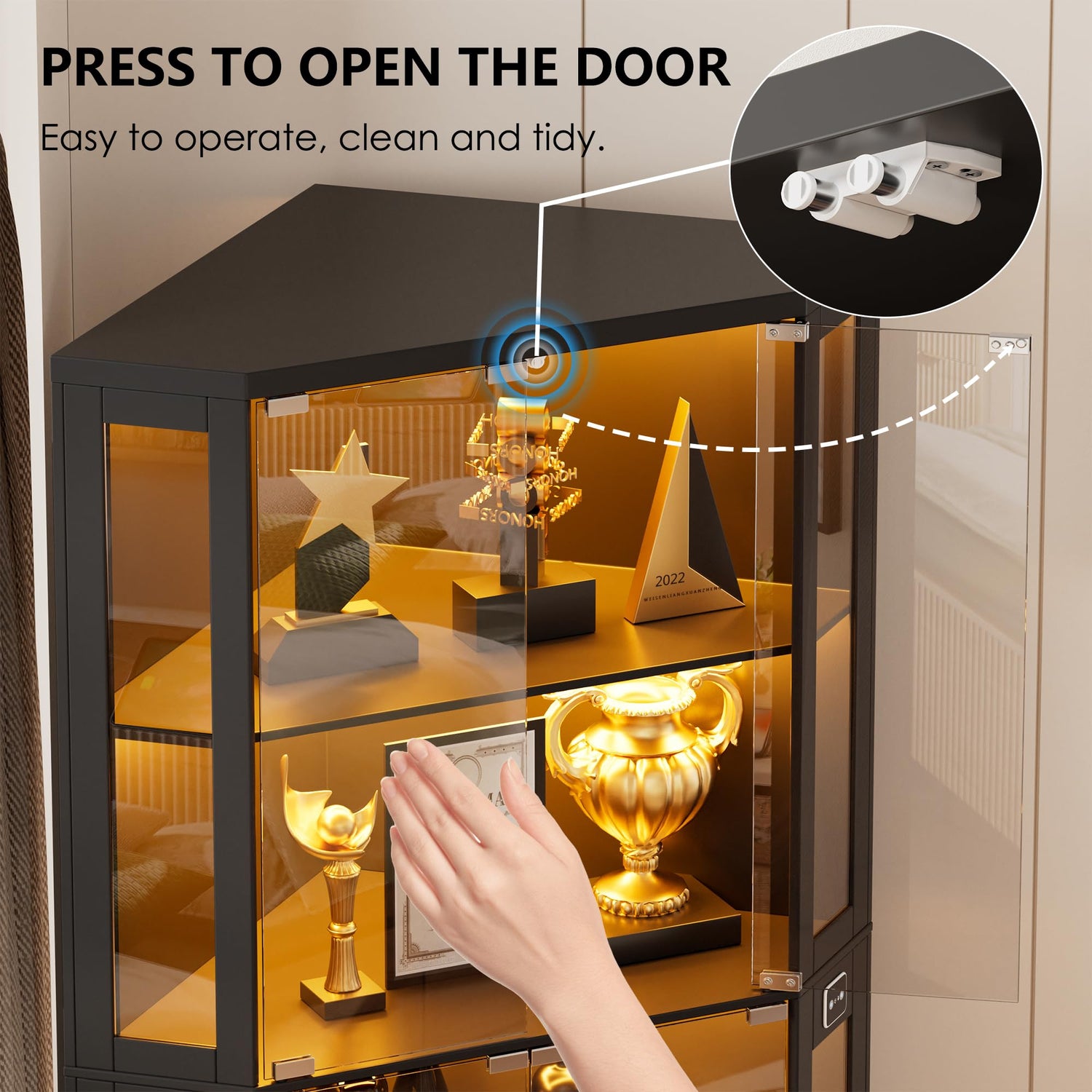 - 【Corner Access with Pop-Up Doors Design】This corner display case is designed with three clear tempered glass doors that pop open with a gentle press. The double door openings make it easy to reach your items—no matter how the cabinet is positioned. Mirrored back panel visually expands space and adds upscale depth for collectibles, decor, or artwork.