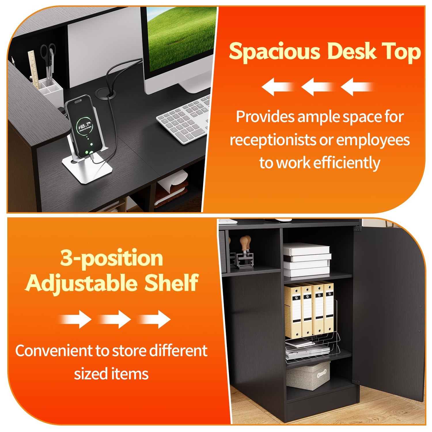 - 【Ample Storage Space】This Large Reception Desk has a spacious desktop, providing ample space for computers, phones, writing materials and other office necessities, a locked drawer and cabinet to store your valuables and documents, and an open adjustable cabinet to allow you to easily access office items.