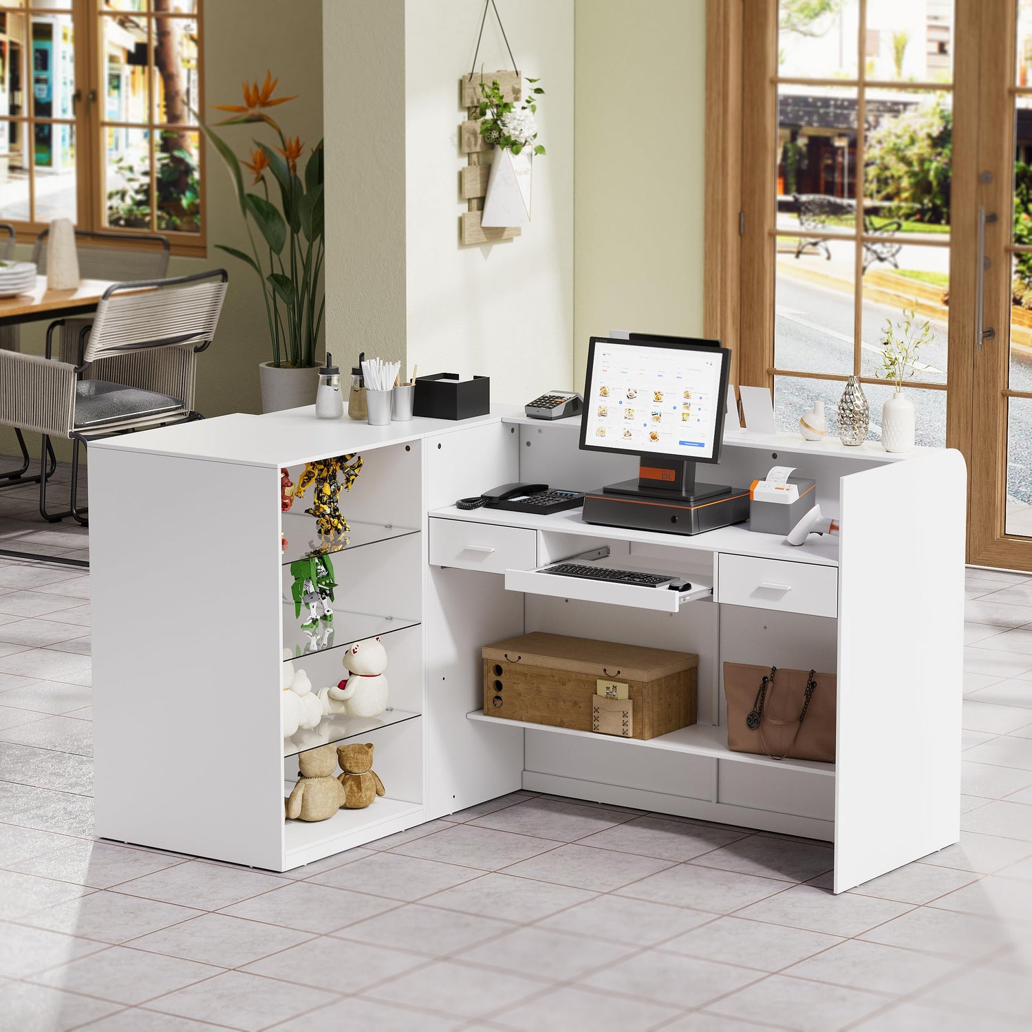 PAKASEPT Reception Desk with Counter for Retail & Checkout,Modern Front Reception Counter with Drawers & Open Shelves,L-Shaped Retail Counter with Storage for Countertop,Beauty Salon,Shop,Bar,White
