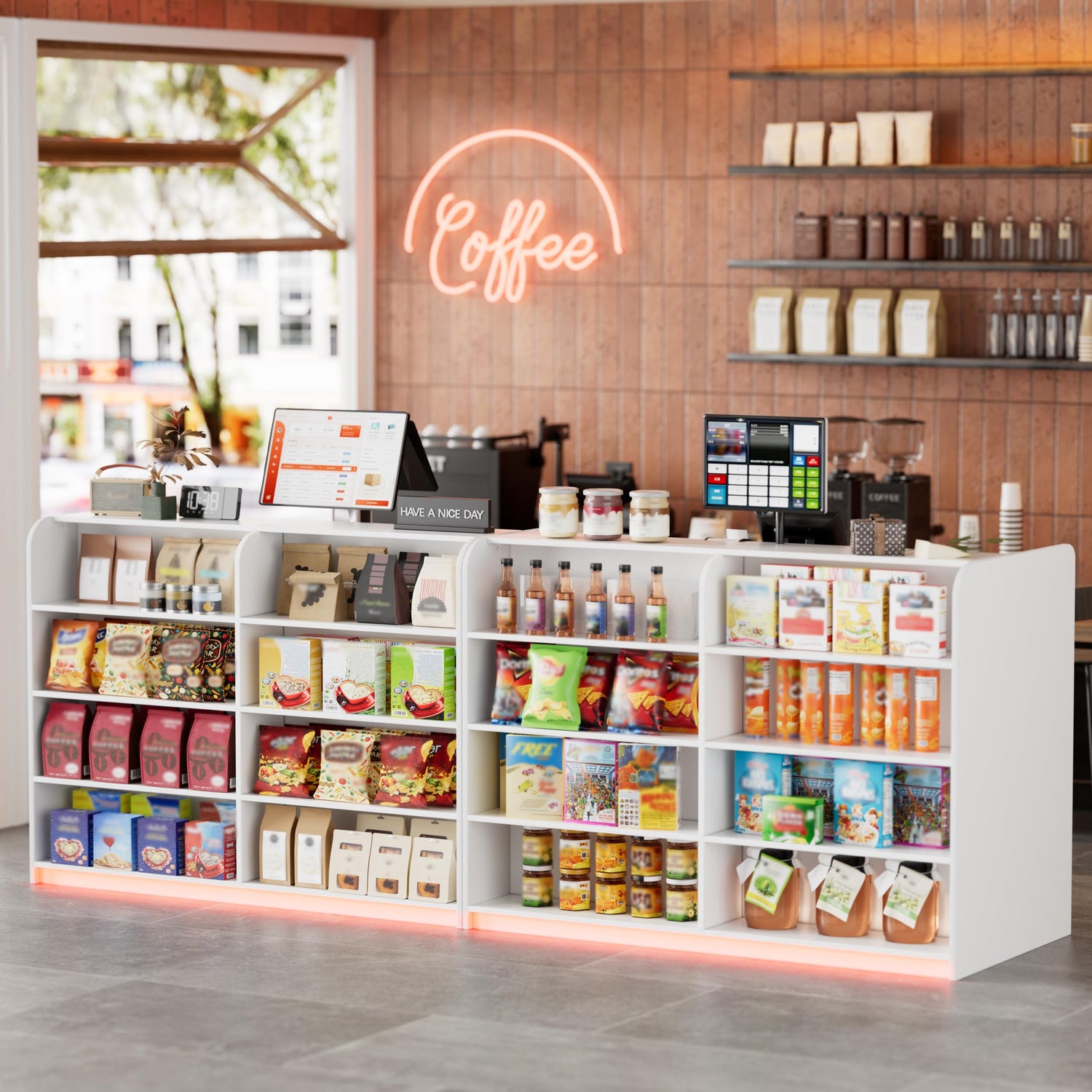 PAKASEPT Reception Desk with Counter for Retail & Checkout,Modern Front Reception Counter with LED Lights,Drawers & Open Shelves,Retail Counter with Storage for Countertop,Beauty Salon,Shop,Bar,White