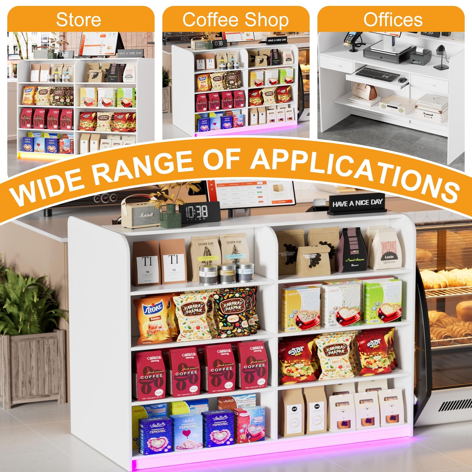 - 【Versatile Application】 - Designed in a suitable size, this white reception desk fits anywhere. More than as a front desk for corporate offices, a retail counter for boutique shops and beauty salons, or even a computer desk in a workstation. Whether you place it in a law office, beauty salon, restaurant, or grocery store, this reception table will be the highlight of your establishment.