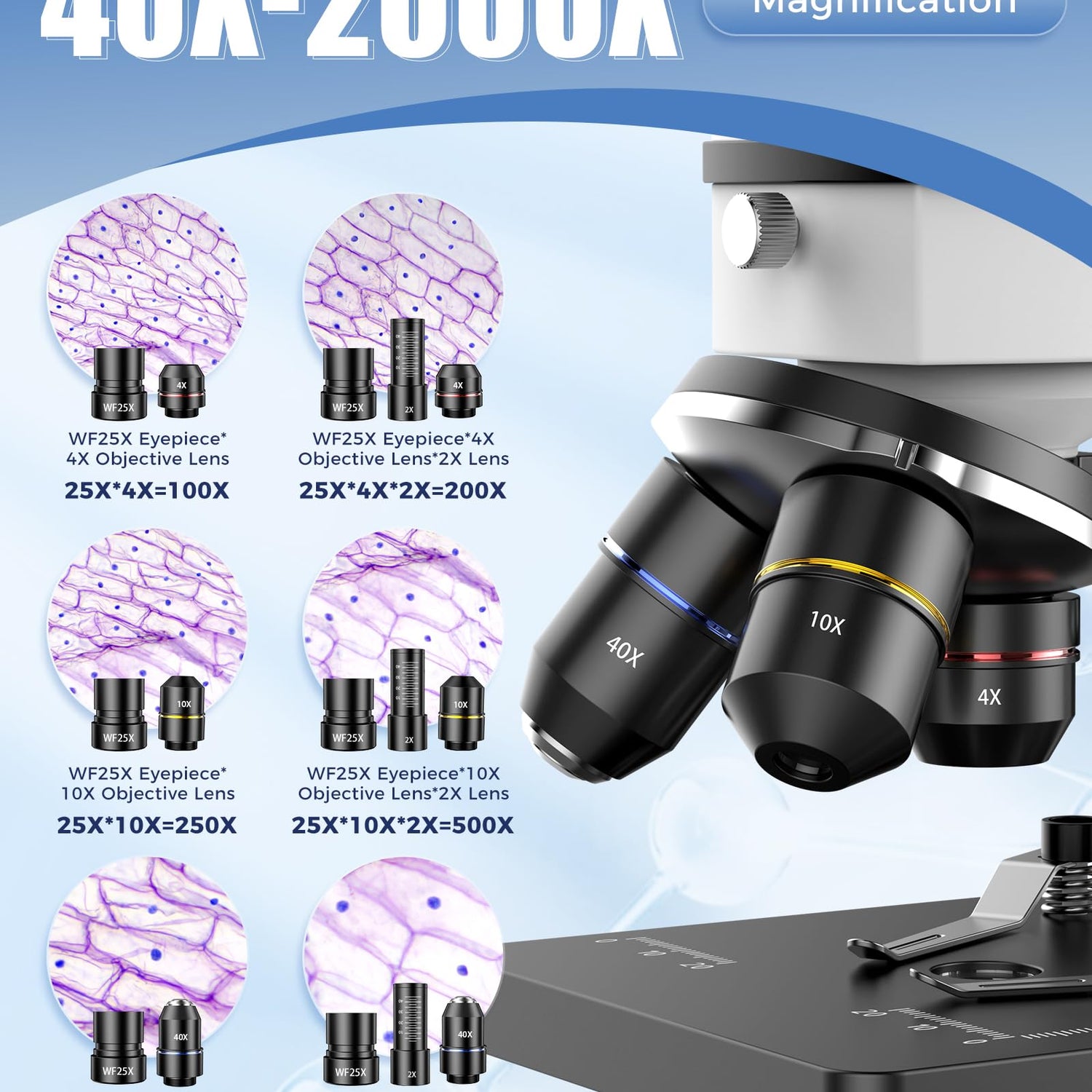 • 【Professional-Grade Magnification & Clarity】 Precision-engineered with WF25X eyepiece & 4X/10X/40X objectives for 6 magnification levels (100X-2000X). Ideal for observing cell structures in biological microscope studies, this compound light microscope delivers lab-certified resolution. Certified compatible with microscopio profesional para laboratorio standards.
