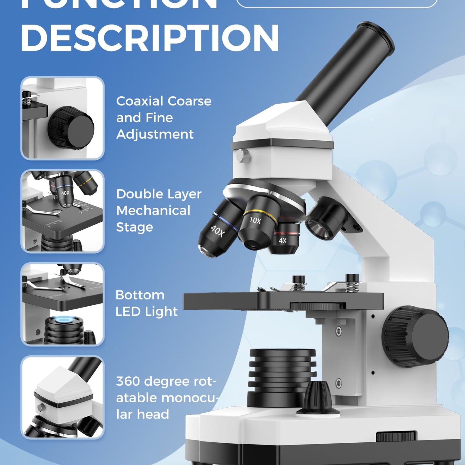 • 【Dual Control Focus System】 Heavy-duty monocular microscope with coarse/fine focusing knobs (0.1mm precision) ensures razor-sharp imaging of bacteria slides. Reinforced metal frame supports microscope for adults professional use in university labs.