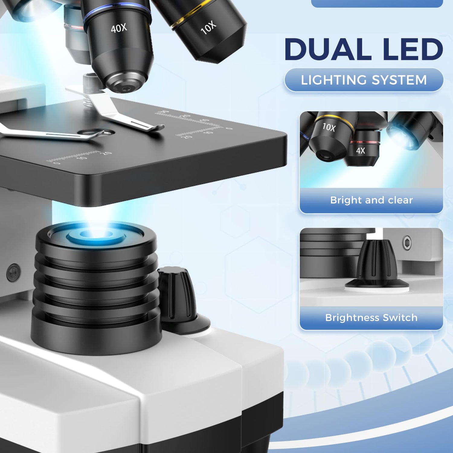 • 【Lab-Grade Illumination Technology】 Dual LED lights (top/bottom) with 6-level brightness control + 0.65 NA condenser creates optimal contrast for science microscope specimens. Perfect for observing plant cells (transparent) and insect wings (opaque).
