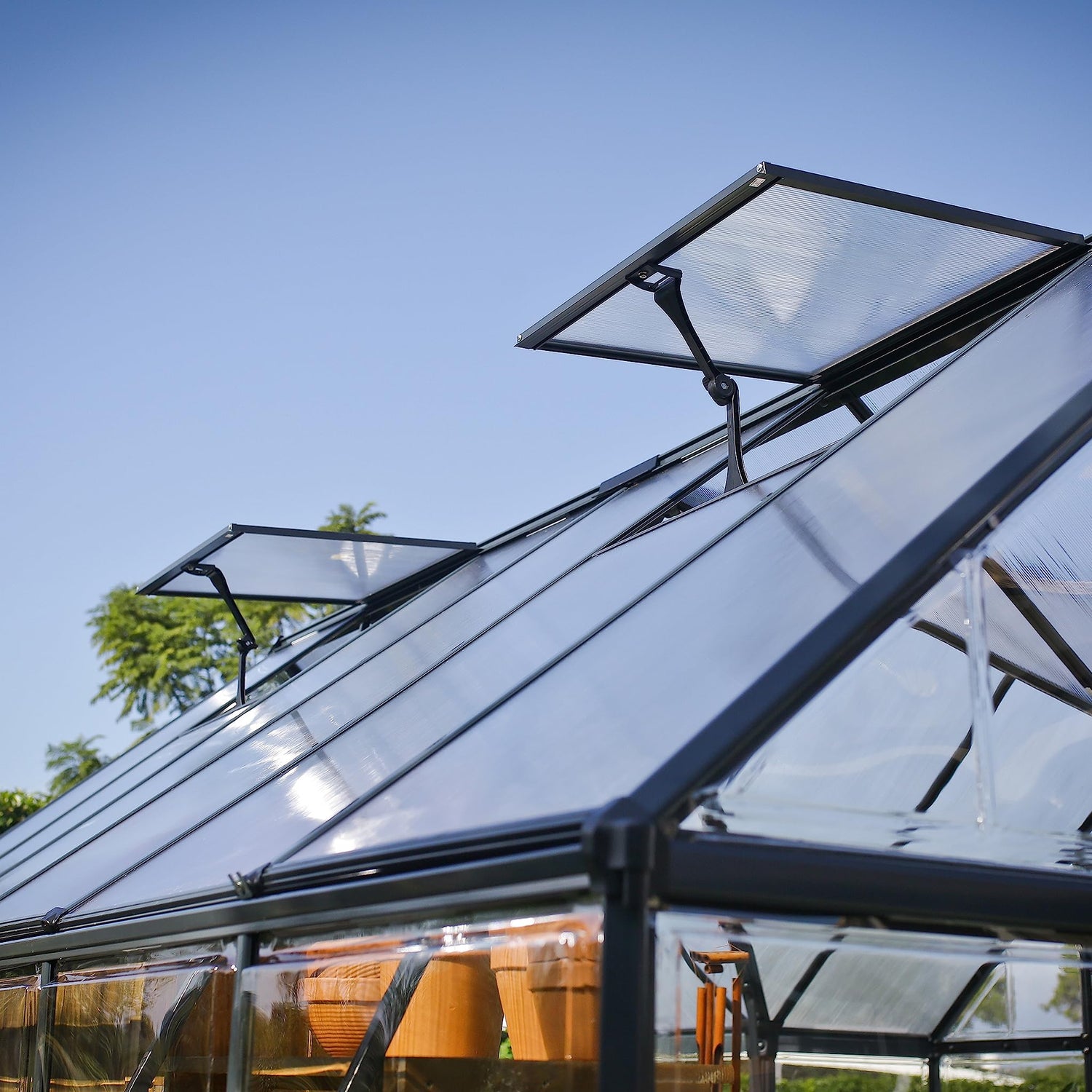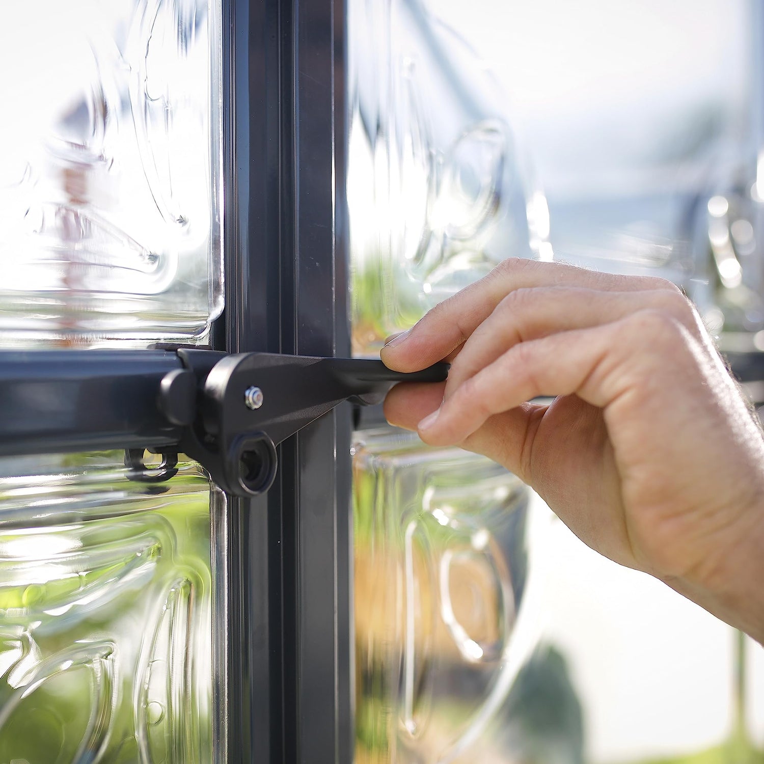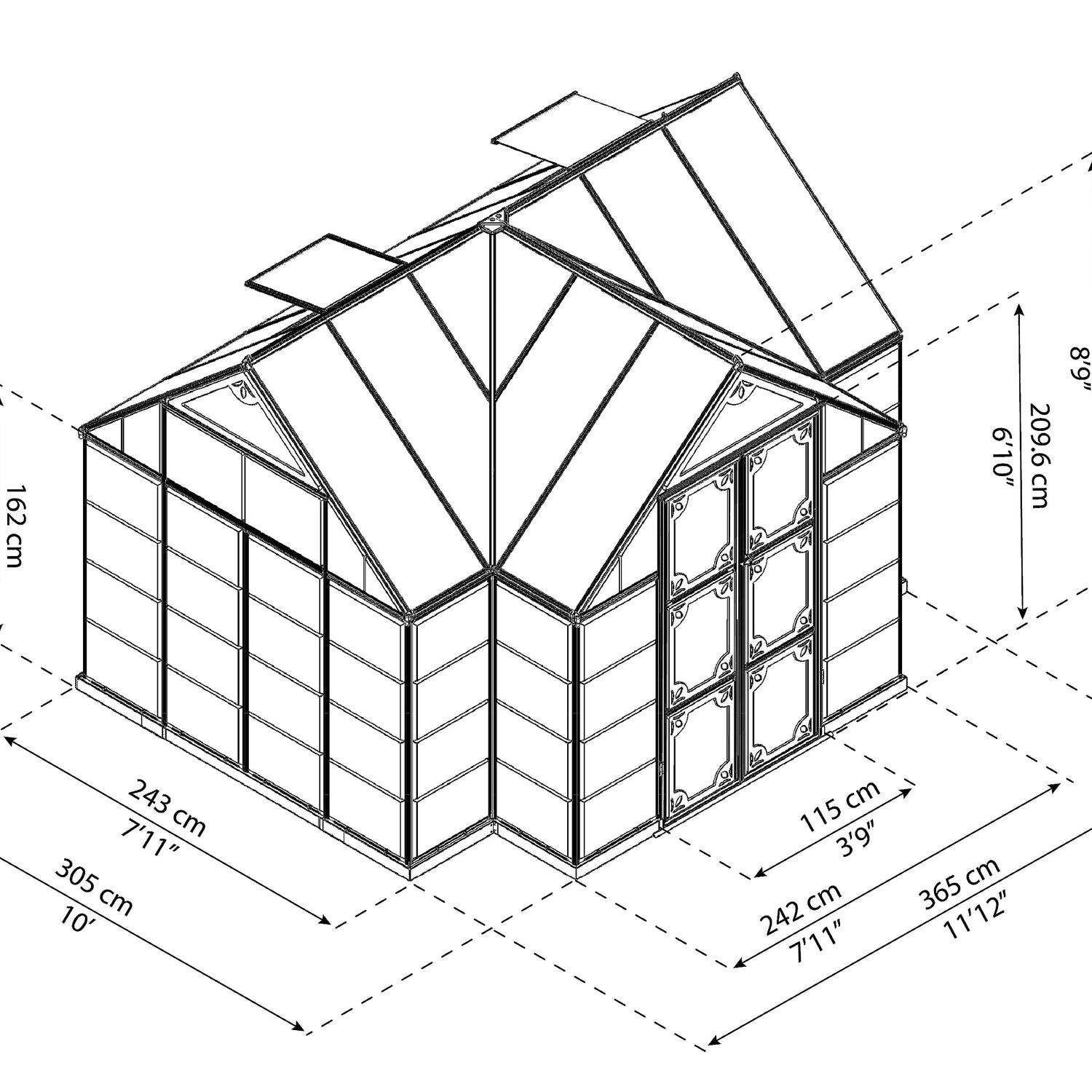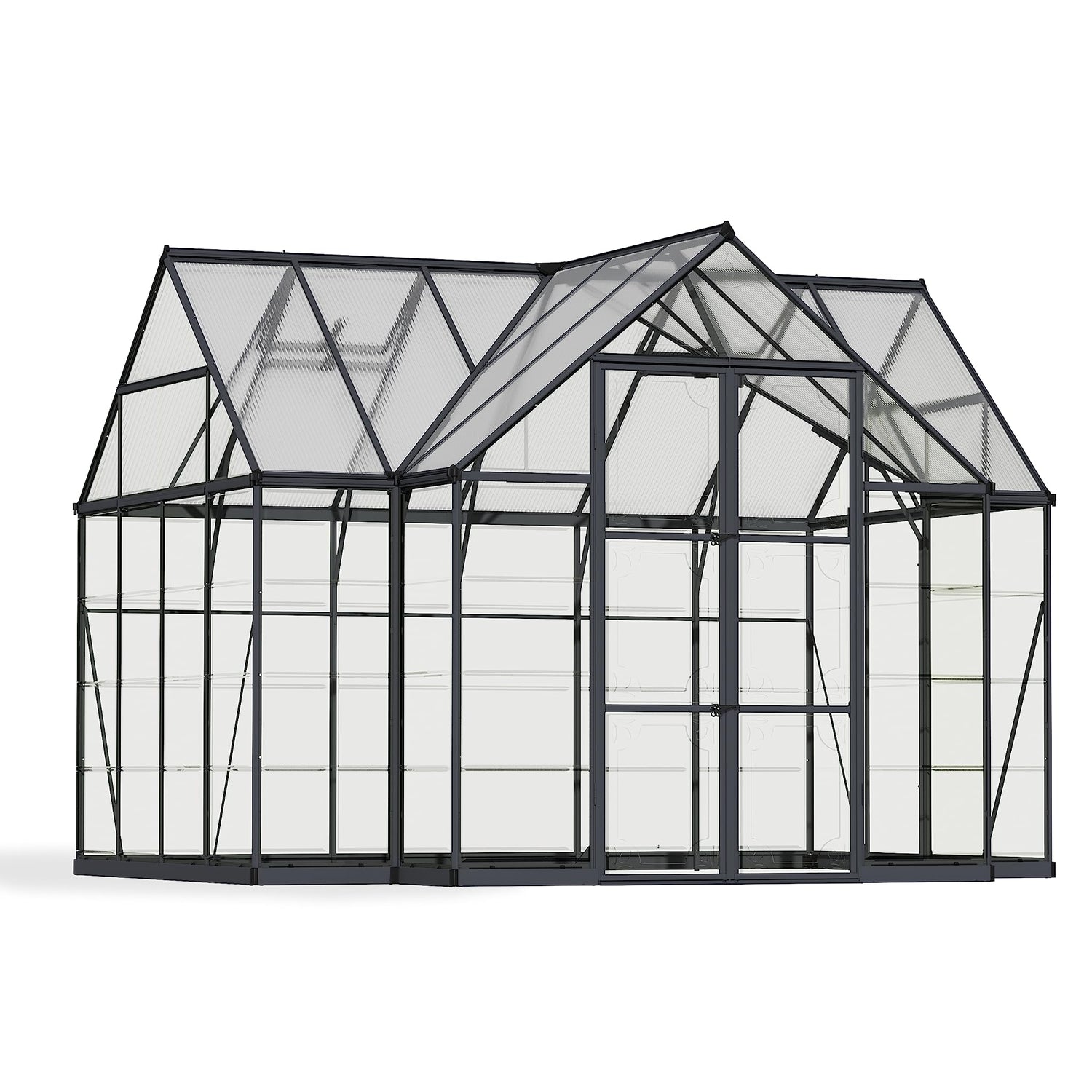 Your Chalet greenhouse has 112 sq. ft. of floor space and the vaulted ceilings have plenty of room for trellising your tall growing plants or climbing vines. Two adjustable roof vents and double swinging doors provide ample ventilation to control heat and humidity. The wide double door opening makes moving items in and out a breeze and it’s also equipped with a threshold ramp for easy access. Over 8 feet of headroom gives you the space you need to work and move around your greenhouse. This versatile structure has a powder coat charcoal Gray aluminum frame and cathedral roof giving it a touch of European style that enhances any space. French doors create an open feeling allowing you to have that outdoor room that you’ve always wanted for relaxation and leisure activities. The step-by-step instructions and sliding panel system will make assembly a snap. Two people can accomplish this setup in approximately two days. Greenhouse attaches to your wood or concrete base as a hold-down. The rust resistant frame and durable polycarbonate panels will allow you to enjoy your greenhouse for years to come and require very little upkeep.