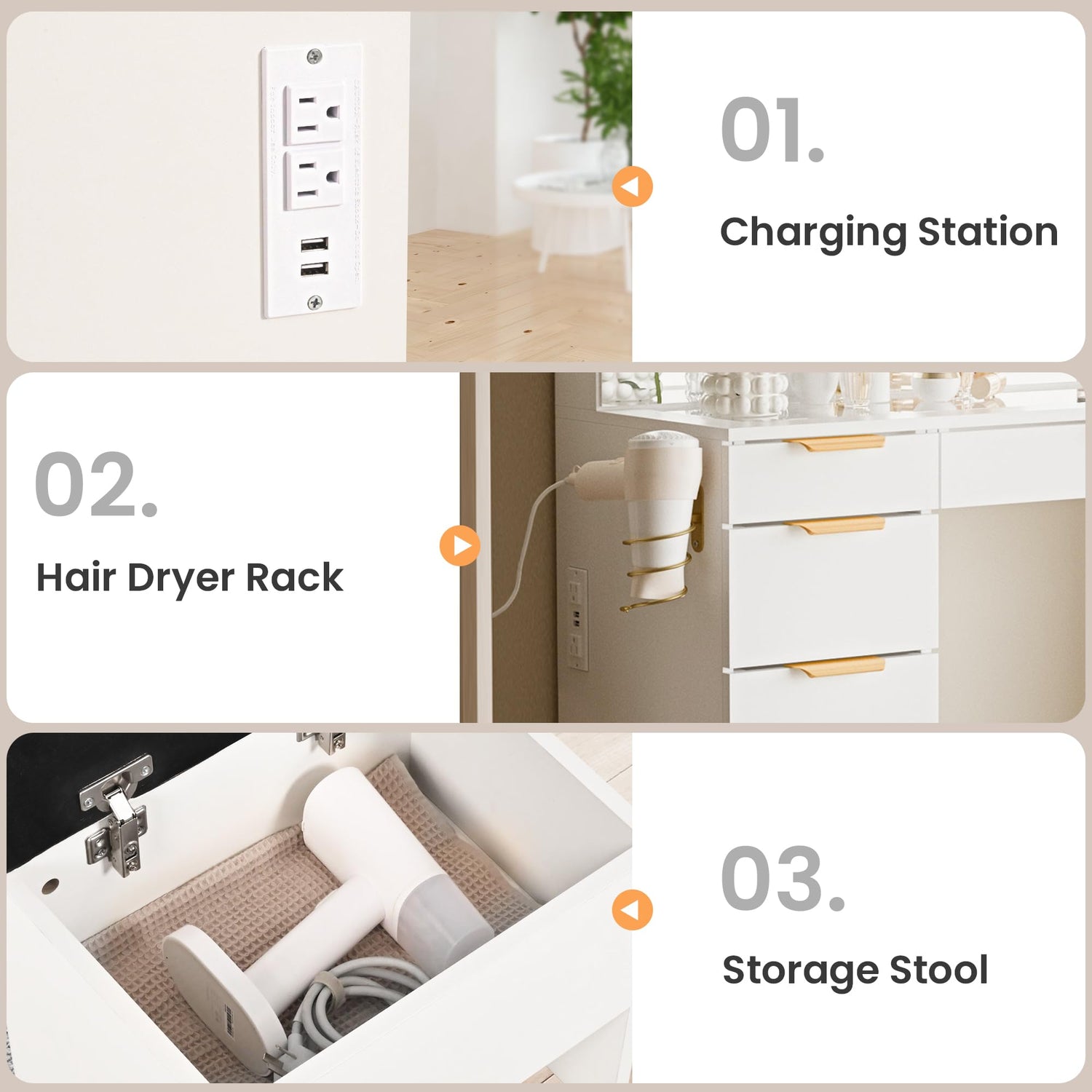 - Extra Functionality and Value: This white vanity desk offers great value with its built-in mirror lighting and storage stool.The outlet is ideal for hairdryers, straighteners, or phone chargers.The included suction mirror provides flexible use. With these practical additions, it meets all your beauty needs and enhances any space