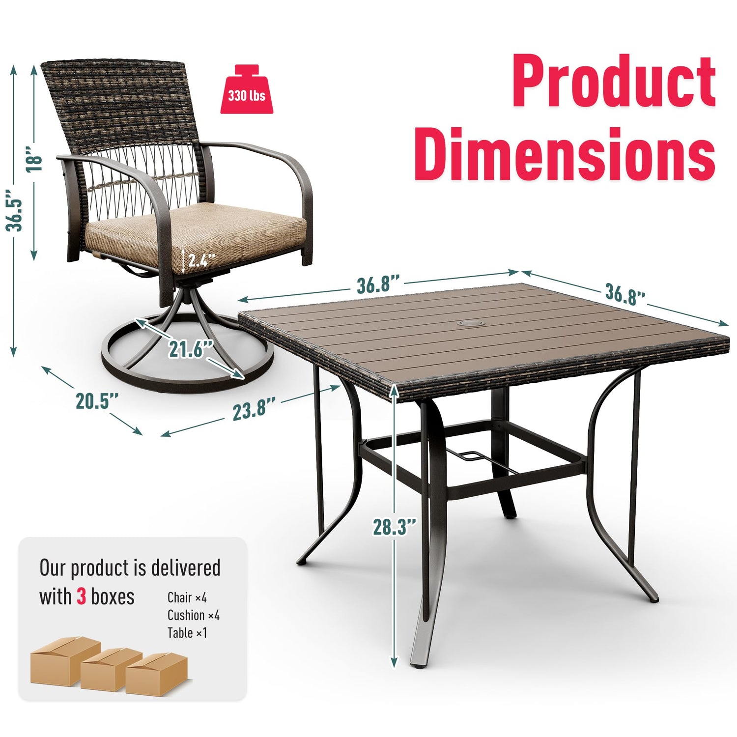 - 【Dimension and Packaging】 Table - 36.8"×36.8"×28.3", Swivel Chair -23.8"×20.5"×36.5", Thickness of cushion: 2.4". The load capacity of the chair is 330 LBS.The item comes in 3 separate boxes. NOTE: 3 boxes may not arrive at the same time. If you find any damage caused in transit, please contact us to help you immediately!