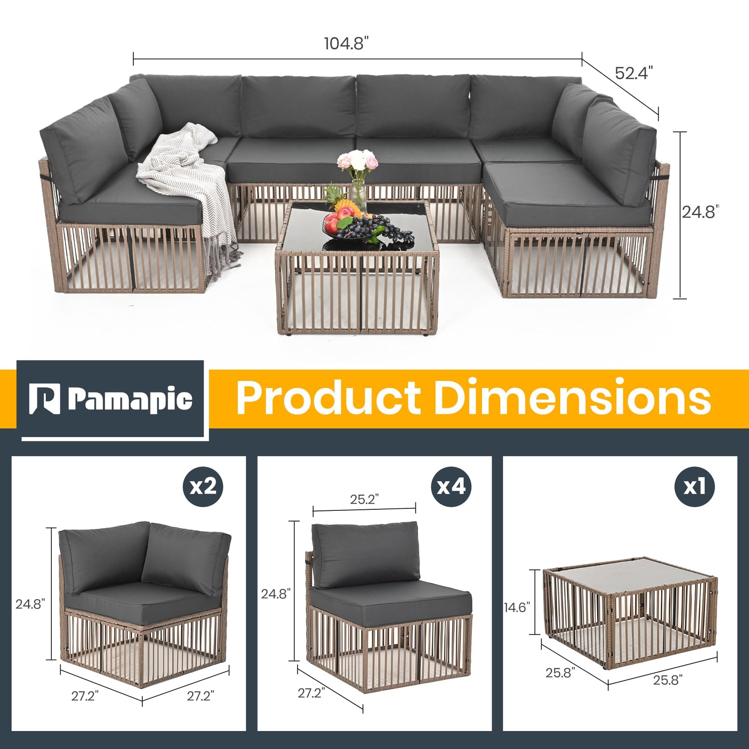 Pamapic 7-Piece Outdoor Sectional Sofa Set, All-Weather PE Rattan Patio Furniture with Washable Cushions Covers, Gray Cushions and Brown Rattan, Dark Gray