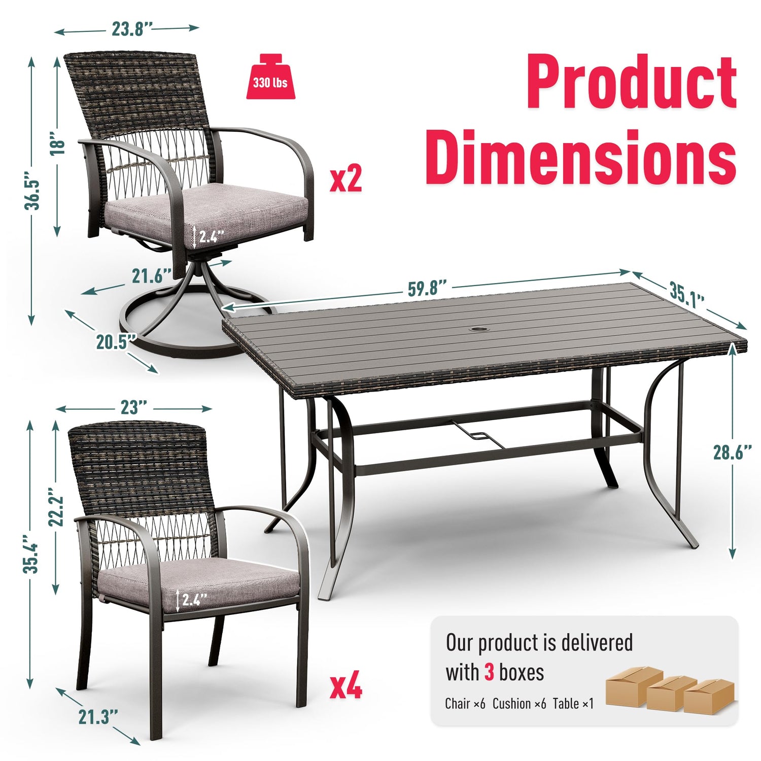 - 【7 Pieces Modern Patio Dining Set】 Including a rectangle dining table, 2 rattan swivel chairs and 4 regular chairs with soft cushions, this outdoor wicker dining set is a relaxing place to have meals or hold a party and can be widely used for patio, deck, backyard, garden, poolside,etc.