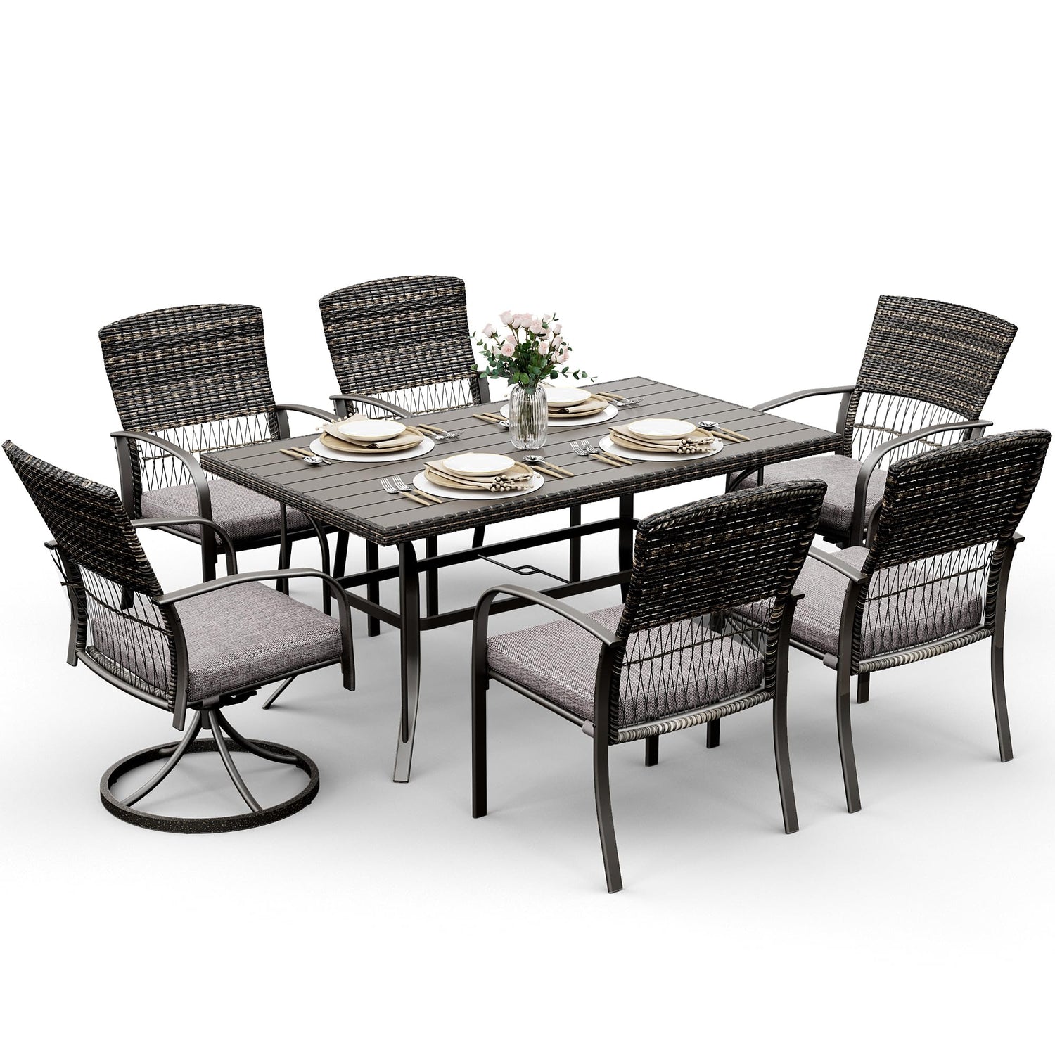 Pamapic 7 Piece Patio Dining Set for 6,Outdoor Wicker Furniture Set for Backyard Garden Deck Poolside with 4 Dining Chairs and 2 Swivel Rockers,Iron Slats Table Top, Removable Cushions(Gray)
