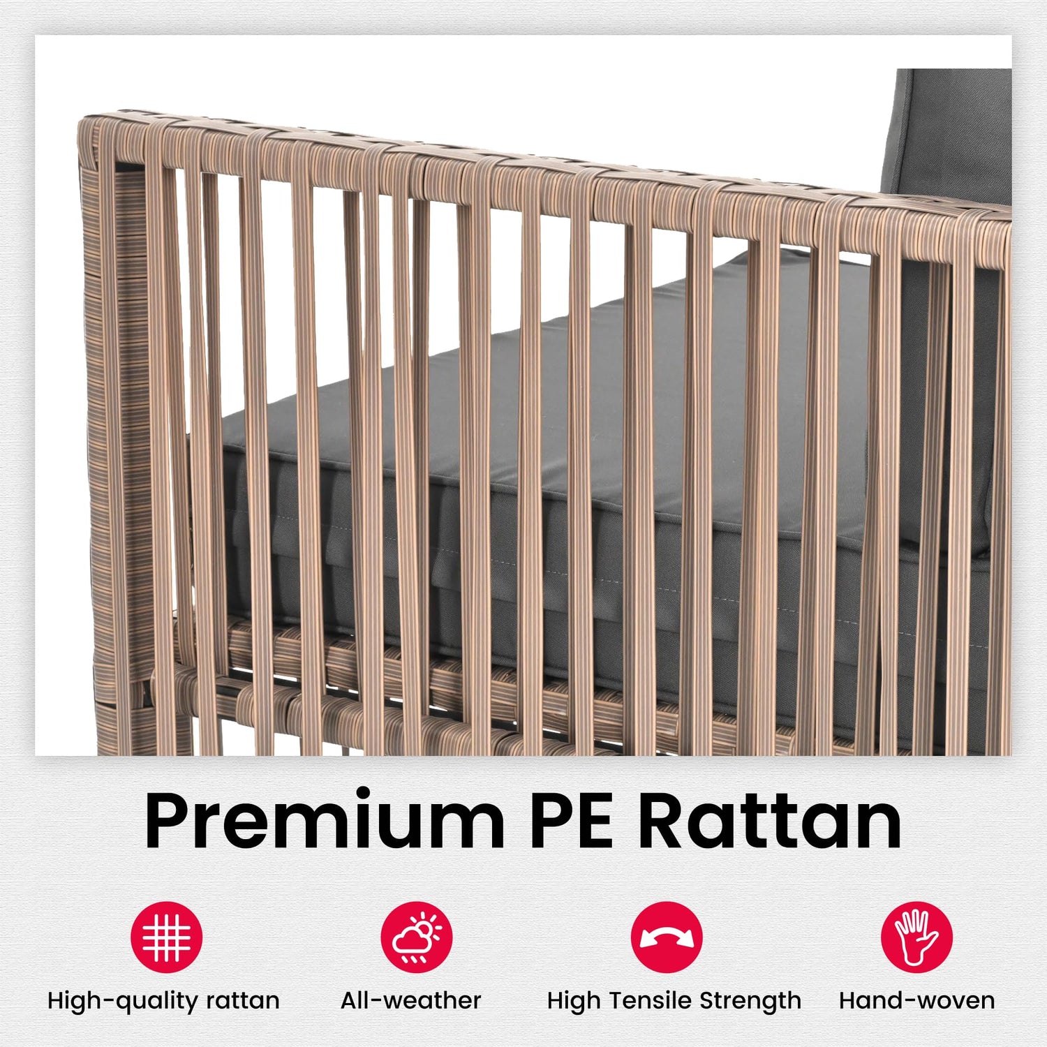 - COMFORTABLE & THOUGHTFUL DESIGN:The premium, plush cushions are designed to provide exceptional comfort. Crafted with 100% polyester fabric and high-density, resilient foam, the outdoor furniture set ensures a luxurious seating experience for you and your guests. The zippered cushion covers are removable and machine-washable, making maintenance a breeze.