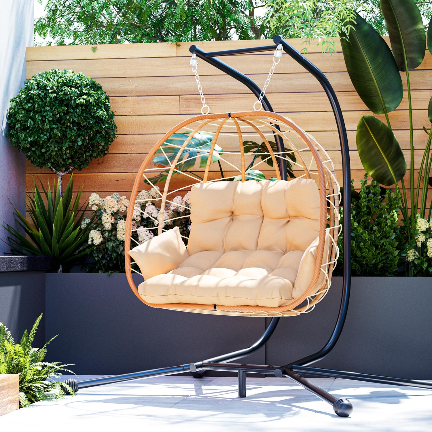 - Stylish Eggshell Design: The double egg chair outdoor shape adds modern flair to any patio, garden, or living room. Its sleek design enhances your outdoor decor
