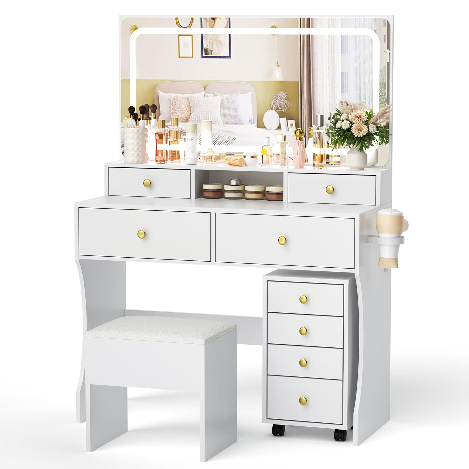 - Built-In Hairdryer Holder with Outlet: Equipped with a dedicated hairdryer holder and power outlet, this vanity mirror with lights desk provides convenient storage and organization for styling tools