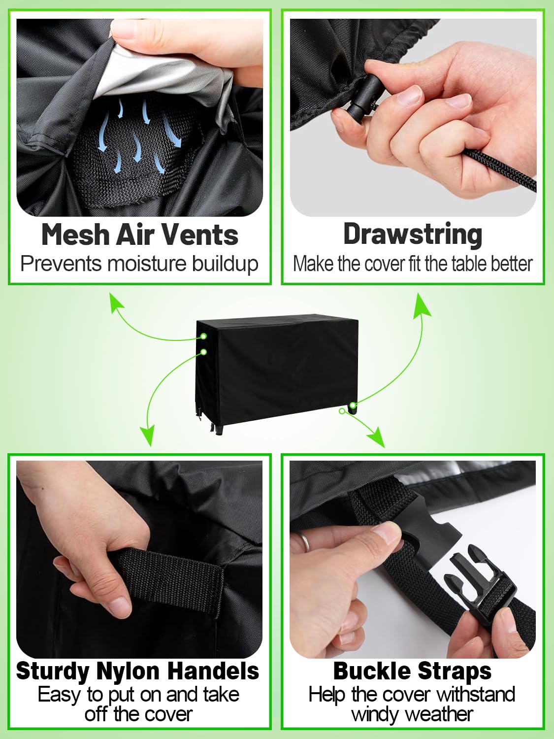 - 【Thoughtful Detail】Two buckle straps that can be tied to the table legs and the drawstring at the hem allow the cover to fit snugly on the prep table and prevents the cover from being blown away in windy weather. Two side handles are securely sewn to the cover, allowing you to remove the cover from the table easily.