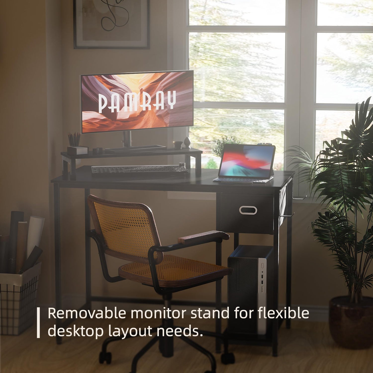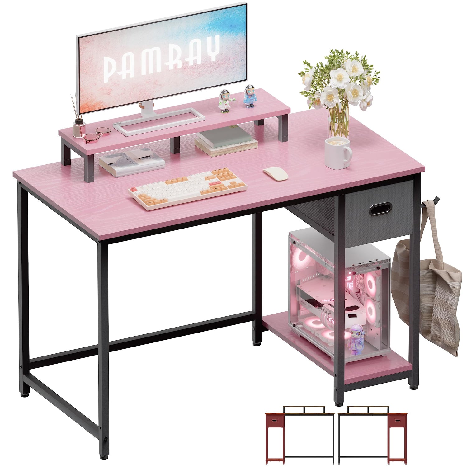 Pamray 39 Inch Computer Desk with Monitor Stand Small Home Office Desks with Non-Woven Storage Drawer for Bedroom Study Table Writing and Work Desk Pink