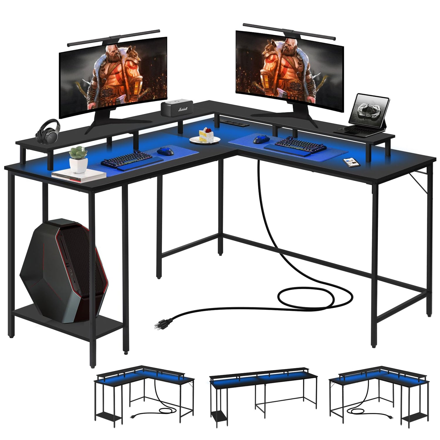 Panana 53.5" L Shaped Computer Desk Gaming Desk with LED Lights and Power Outlets, Reversible L Shaped Corner Desk with Monitor Stand, Home Office Desk with Shelf and USB Port (Black)