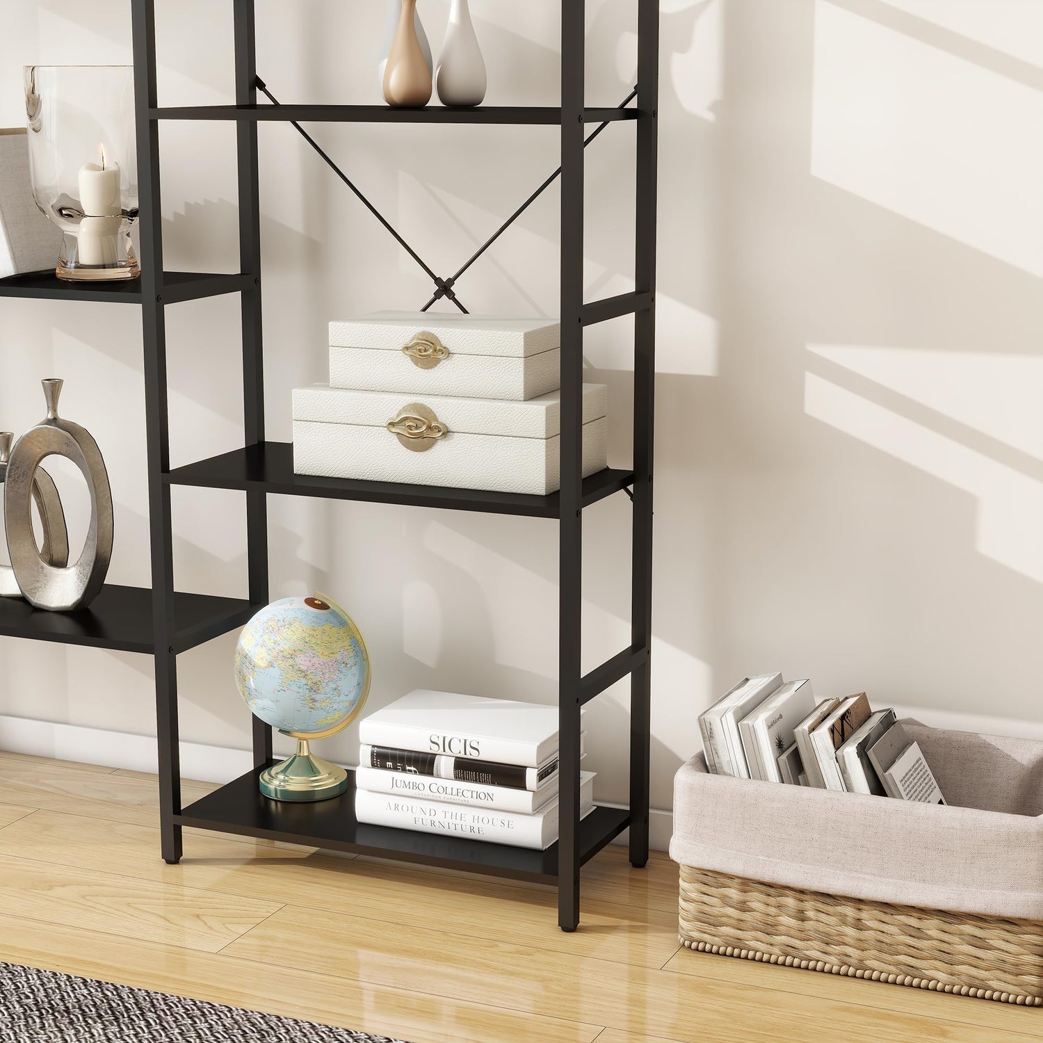 Introducing the Panana Industrial 4-Tier Bookshelf with 11 Open Shelves and Metal Frame in Black, the ideal storage solution that beautifully marries style and functionality. This striking ladder bookshelf not only offers ample open storage but also elevates the aesthetic of any room with its modern design.