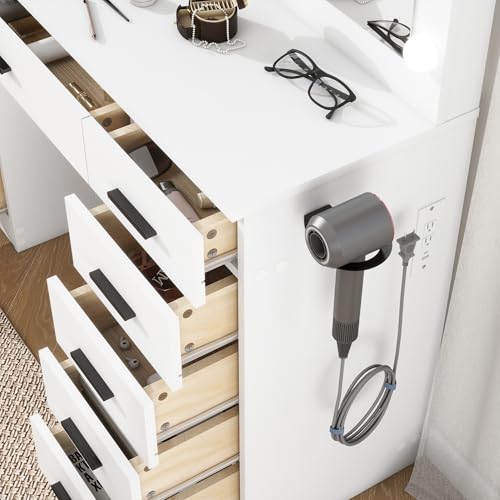 - Convenient Add-Ons for Enhanced Functionality: The dresser features an optional hairdryer holder that can be installed beside the dresser based on your preference, along with a built-in power outlet, making your daily routine more efficient and hassle-free.