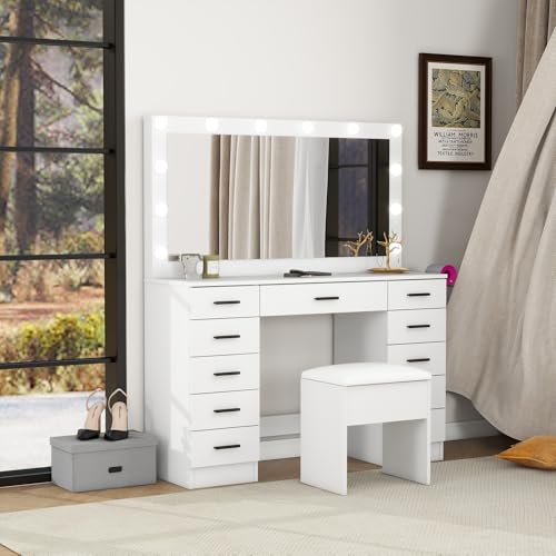 Panana Vanity Desk Set Large Mirror and Lights, Makeup Table with 11 Drawers, Power Outlet, Storage Cushioned Stool, 3 Lighting Modes, Dressing Table for Bedroom Dressing Room (White)