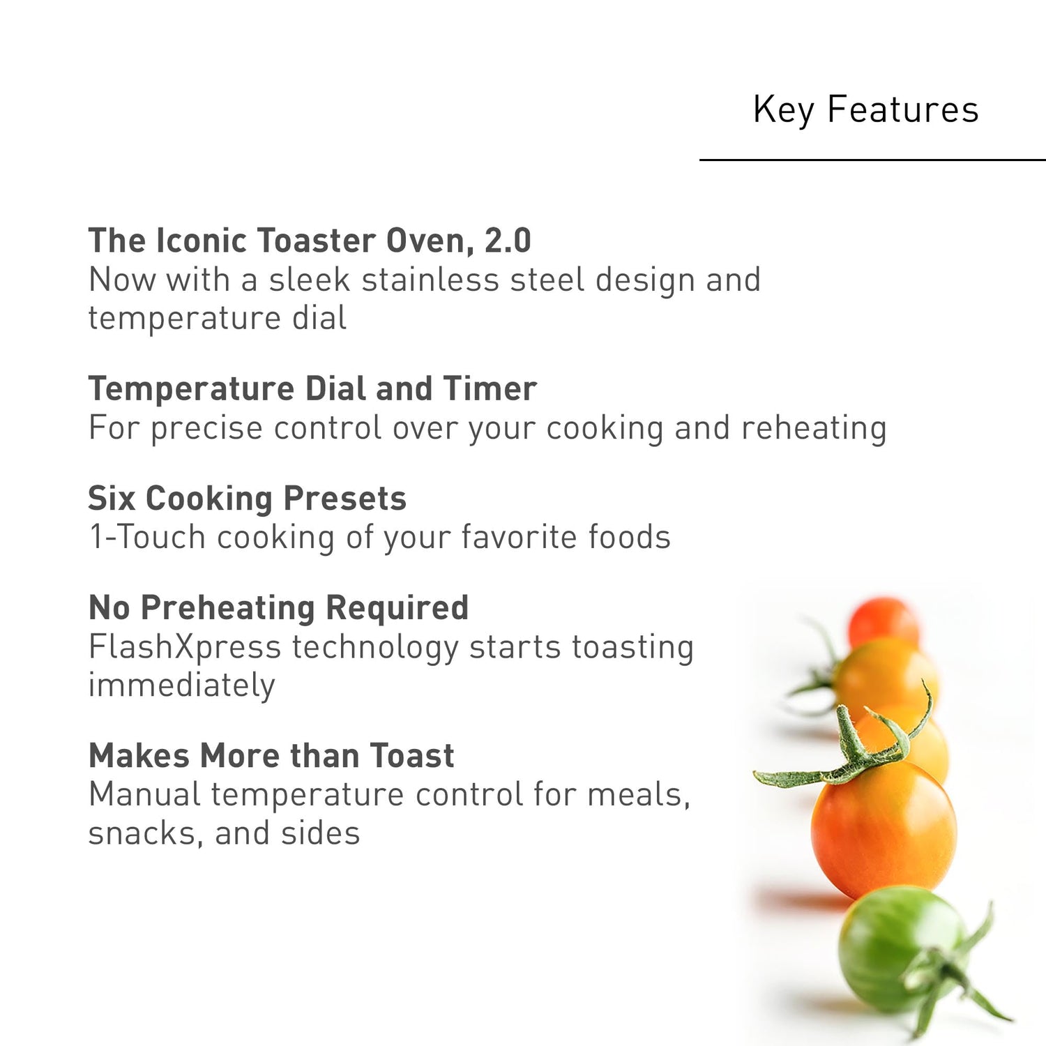- Compact, Attractive Design that Fits Anywhere: The FlashXpress toaster's unique design had been improved with a sleek dial and stainless steel exterior; its small footprint is perfect for any kitchen décor or countertop