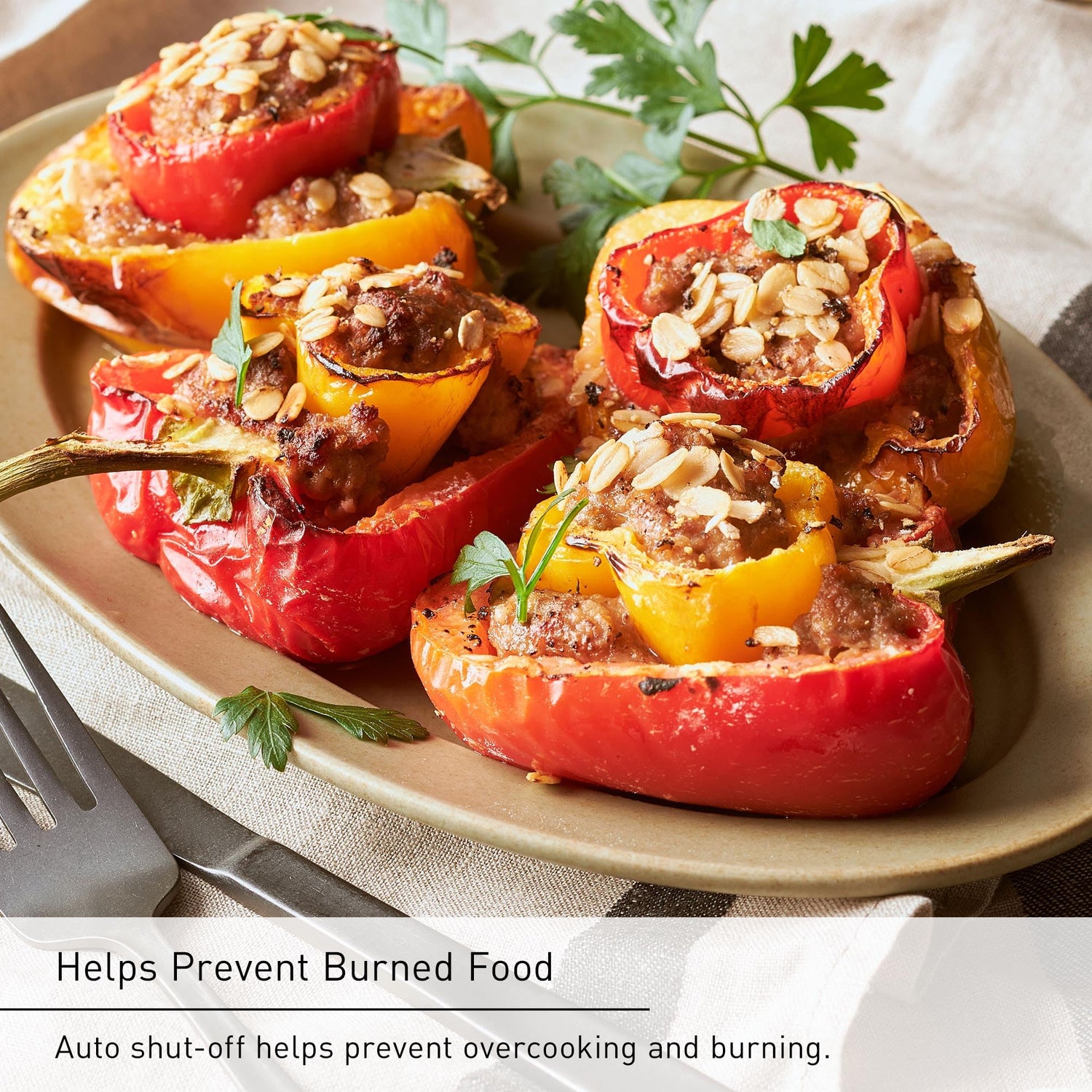 - Safety Features: Toaster oven's baking rack is connected to the oven door to smoothly pull the rack toward you as the door is opened; smart sensor heats food evenly; auto shut-off helps prevent burning