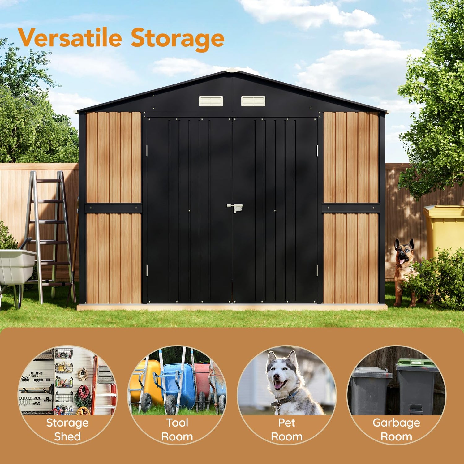 - [Security and Durability] The whole storage shed is a steel frame structure, the metal garden storage shed adopts electro-galvanized steel process and paint treatment, which is suitable for various climates, without worrying about the metal rusting, the all-metal storage shed will not be deformed by the sun, and has excellent moisture-proof ,UV resistant performance.