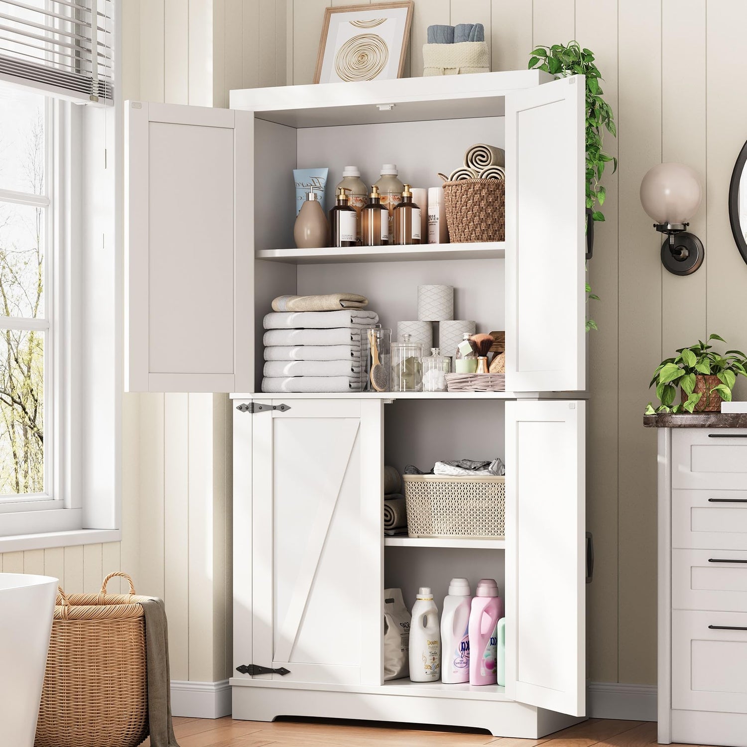 - Elevate your kitchen or dining space with this Farmhouse Kitchen Pantry Cabinet. Measuring 13.38" D x 29.9" W x 68" H, it combines style and function, offering ample storage with 4 doors and adjustable shelves. The sturdy frame and classic white finish blend seamlessly with farmhouse or modern decor, making it a versatile addition to any home. Perfect for organizing food, cookware, or dining essentials, this cabinet keeps your space tidy and stylish.
