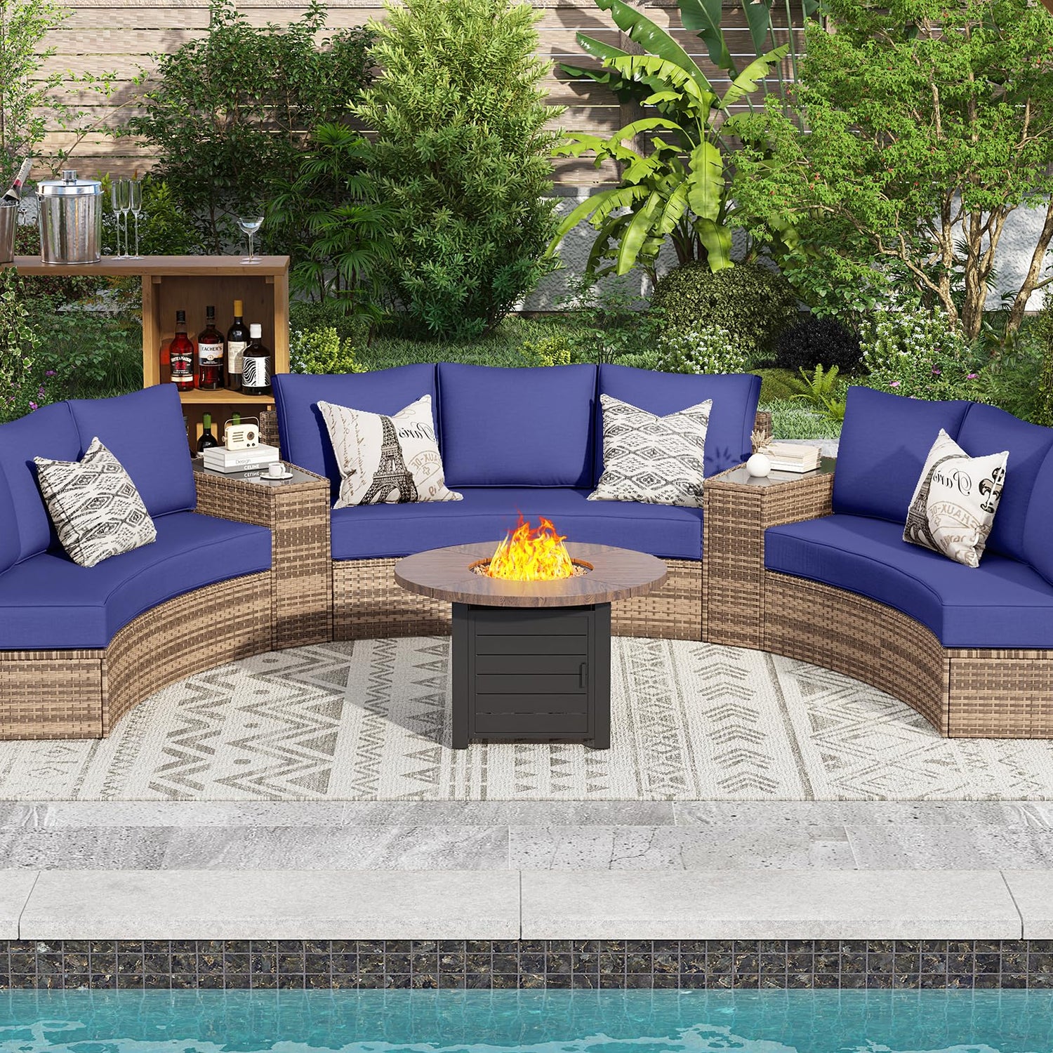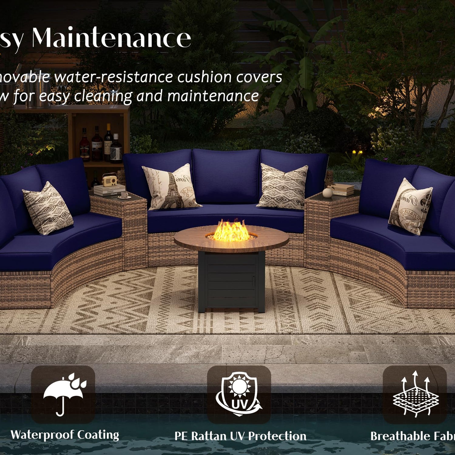 - Outdoor Furniture Set: Unique semi-circular design, shiny blue cushions complementing durable grey-brown rattan, spacious seating for 9 people, creating an elegant foundation for your outdoor space.